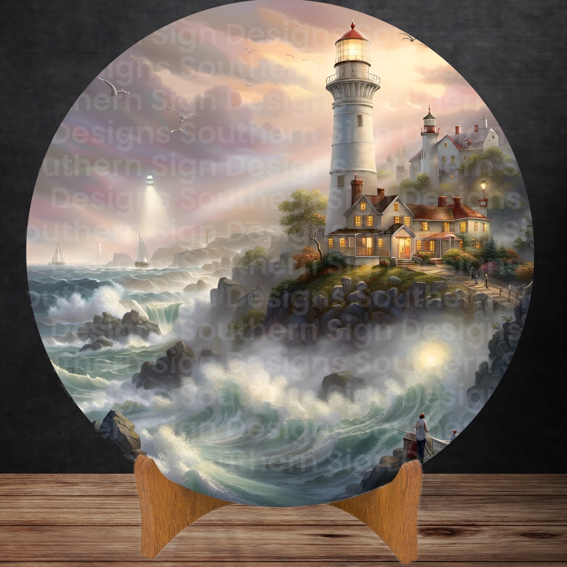Immerse yourself in the soothing embrace of coastal tranquility with our enchanting wreath sign, graced by the image of a majestic lighthouse standing sentinel by the gentle seas. This evocative tableau captures the essence of serene beauty and the timeless allure of the ocean's embrace, as the lighthouse's steadfast presence harmonizes with the soft, comforting hues of the surroundings. Meticulously designed to evoke a sense of peaceful serenity, from the lighthouse's guiding light to the intricate textures of the sea and sky, the scene invites you to embrace the spirit of nature's grace and the soothing embrace of coastal landscapes.
