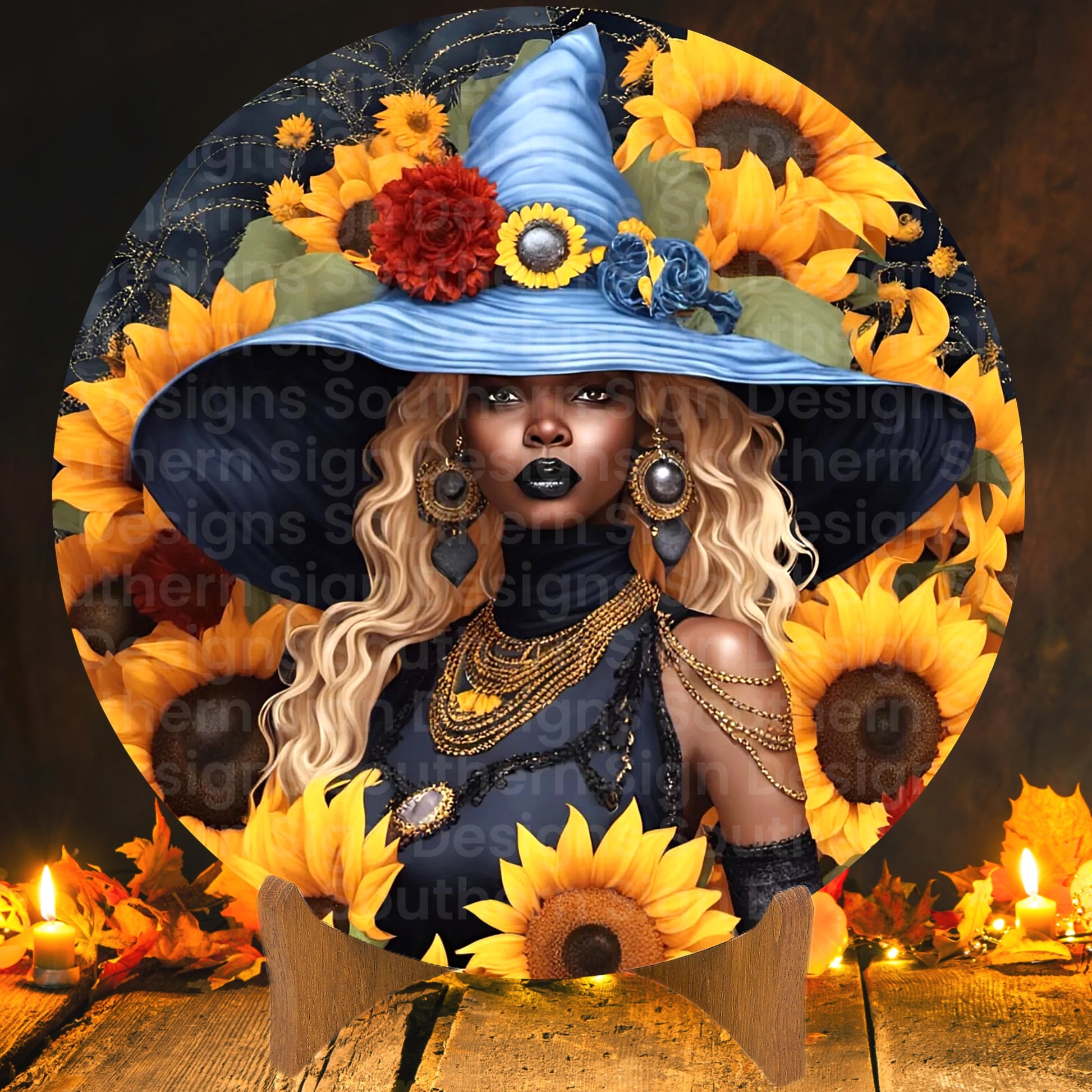 African American Sunflower Autumn Witch Wreath Sign