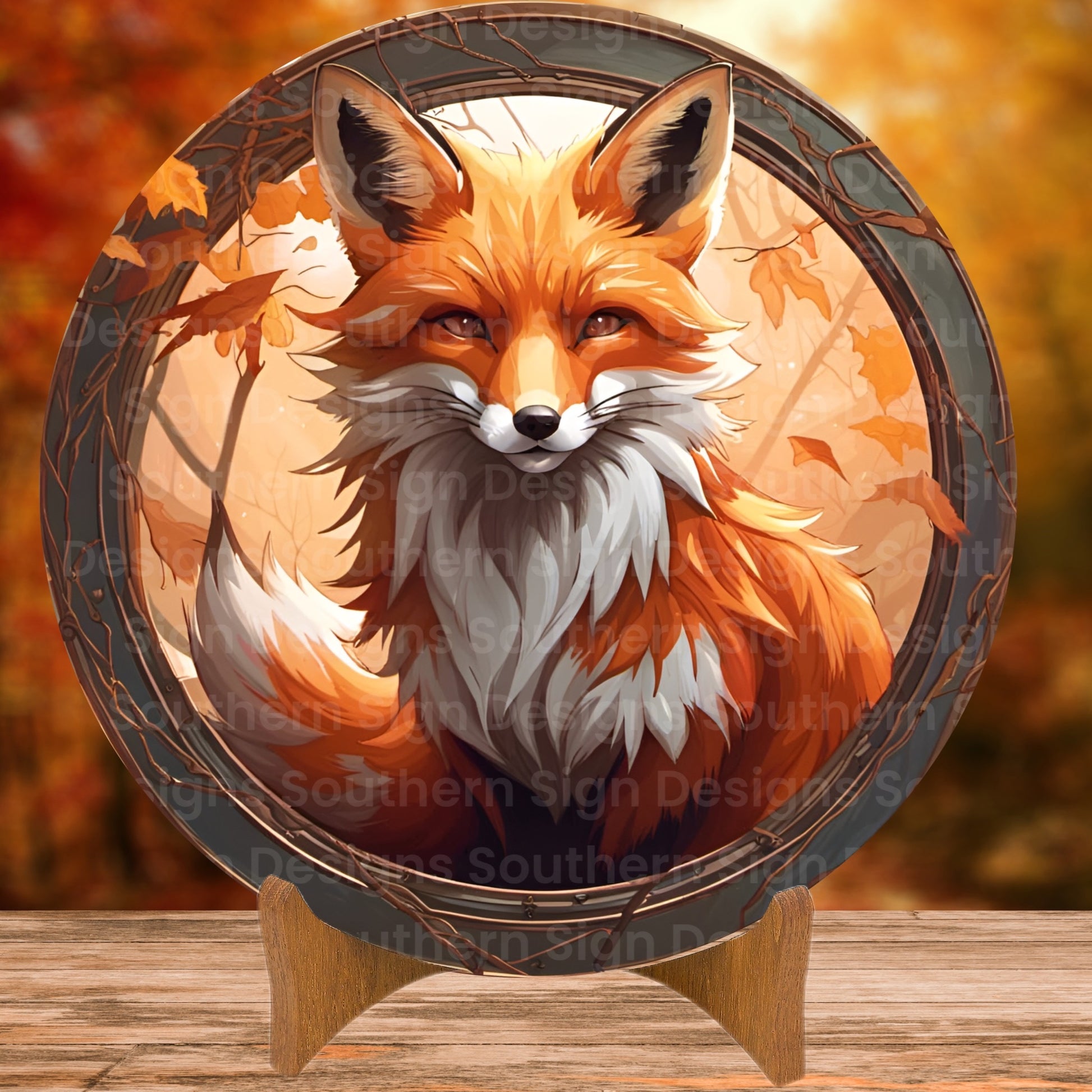Immerse yourself in the serene beauty of the season with our fall wreath sign, showcasing a contemplative red fox amidst the enchanting embrace of a breathtaking autumn forest. This captivating piece captures the essence of tranquility, as the silent fox becomes a harmonious part of the vibrant foliage and golden hues. Its poised gaze reflects both curiosity and calm, echoing the peaceful ambiance of the woodland surroundings.