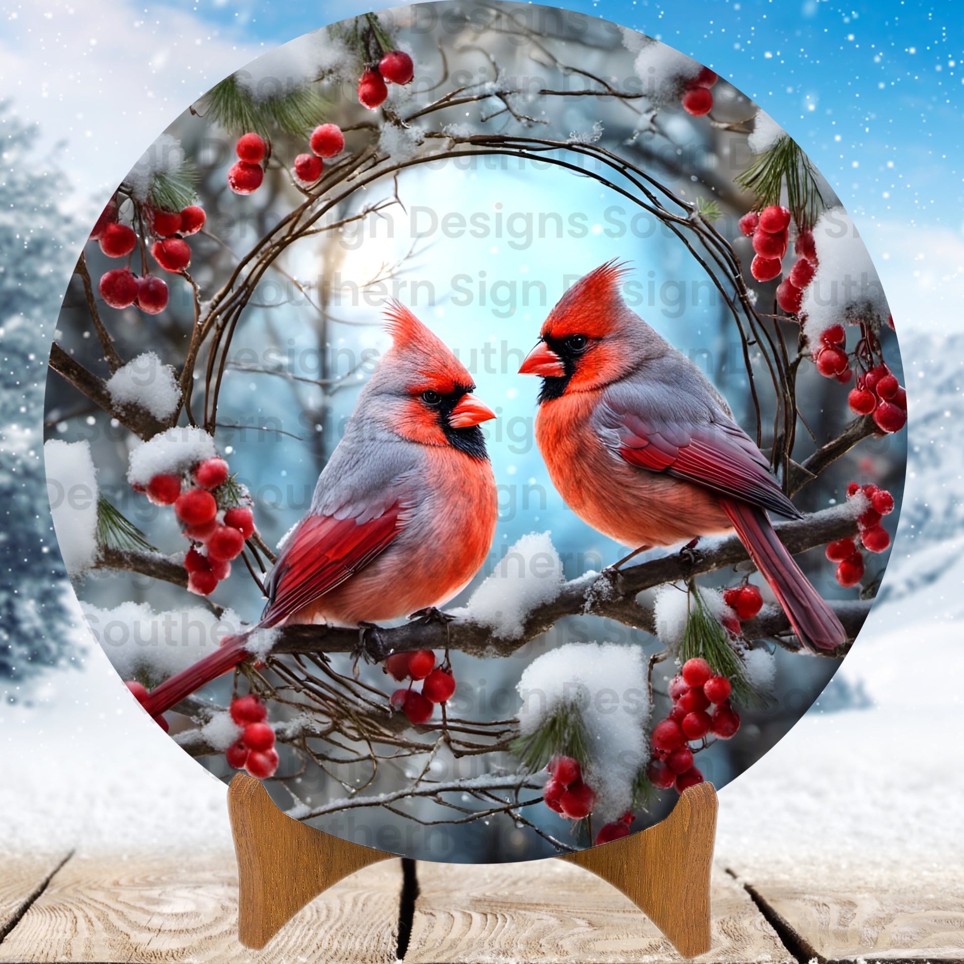 Immerse yourself in the serene beauty of winter with our captivating wreath sign, depicting two exquisite cardinals perched on a rustic wood branch against the backdrop of a tranquil winter forest. This enchanting piece captures the essence of seasonal tranquility and the vibrancy of nature's colors. Meticulously designed, from the cardinals' graceful poses to the intricate textures of the wood and snow-laden boughs, the scene exudes an air of natural elegance and serene charm.