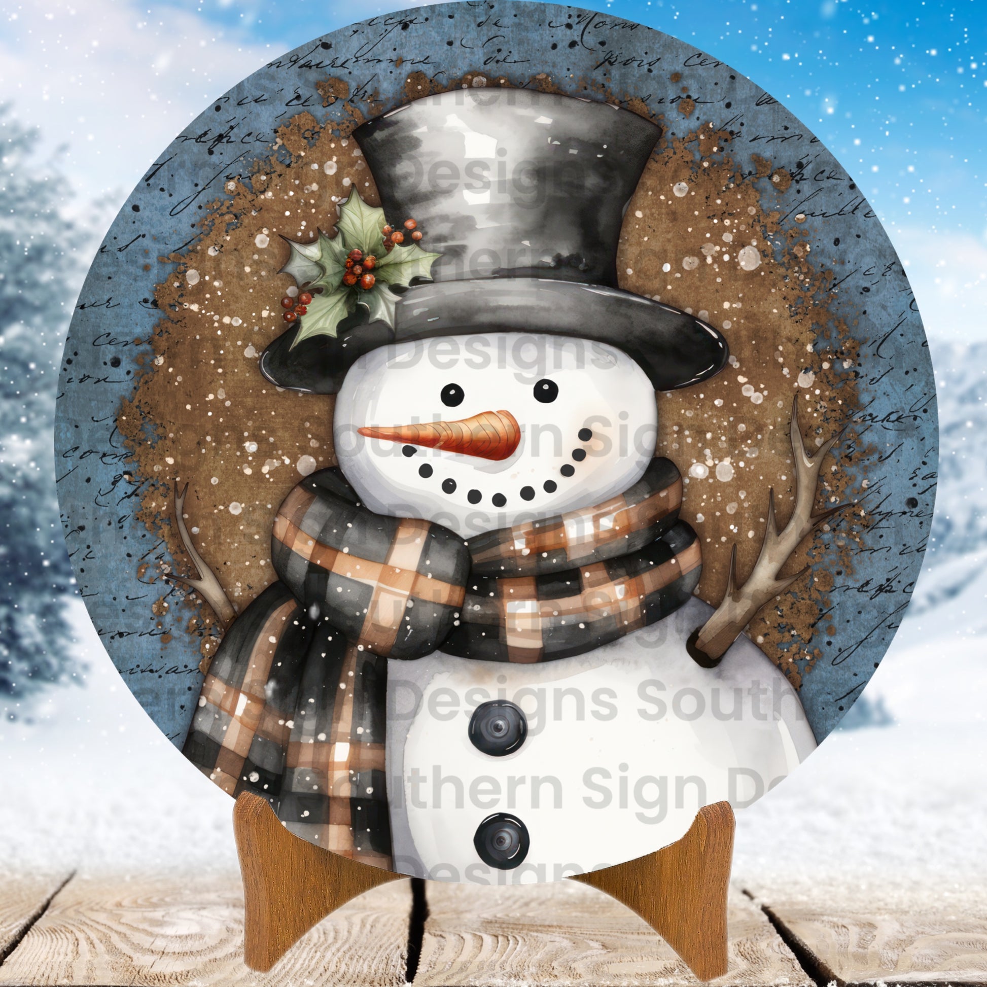 Black and Orange Plaid Scarf Snowman with Blue Rustic Frame Winter Wreath Frame