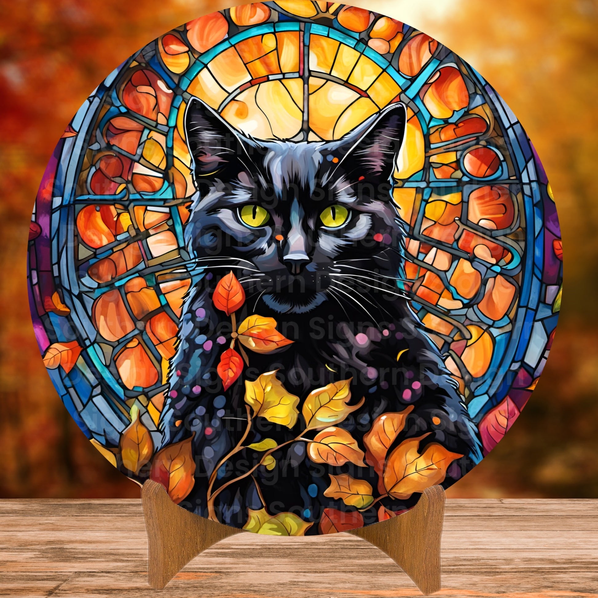 Black Cat Stained Glass Fall Wreath Sign