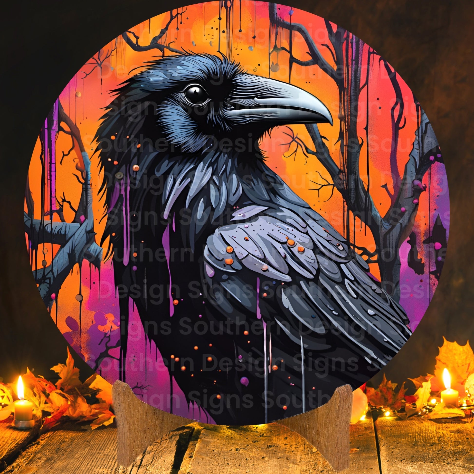 The enigmatic raven takes center stage, its ebony feathers glistening with an air of mystery and wisdom, while the background paints an evocative scene with hues of deep purples, velvety blacks, and eerie oranges. This bewitching fusion of colors sets the stage for an atmospheric display that captures the essence of both allure and unease. Hang this extraordinary wreath sign on your wall or door, inviting the enigmatic aura of the raven and the enchantingly spooky ambiance of its surroundings to enchant your space, making it an ideal centerpiece for the season's celebrations.