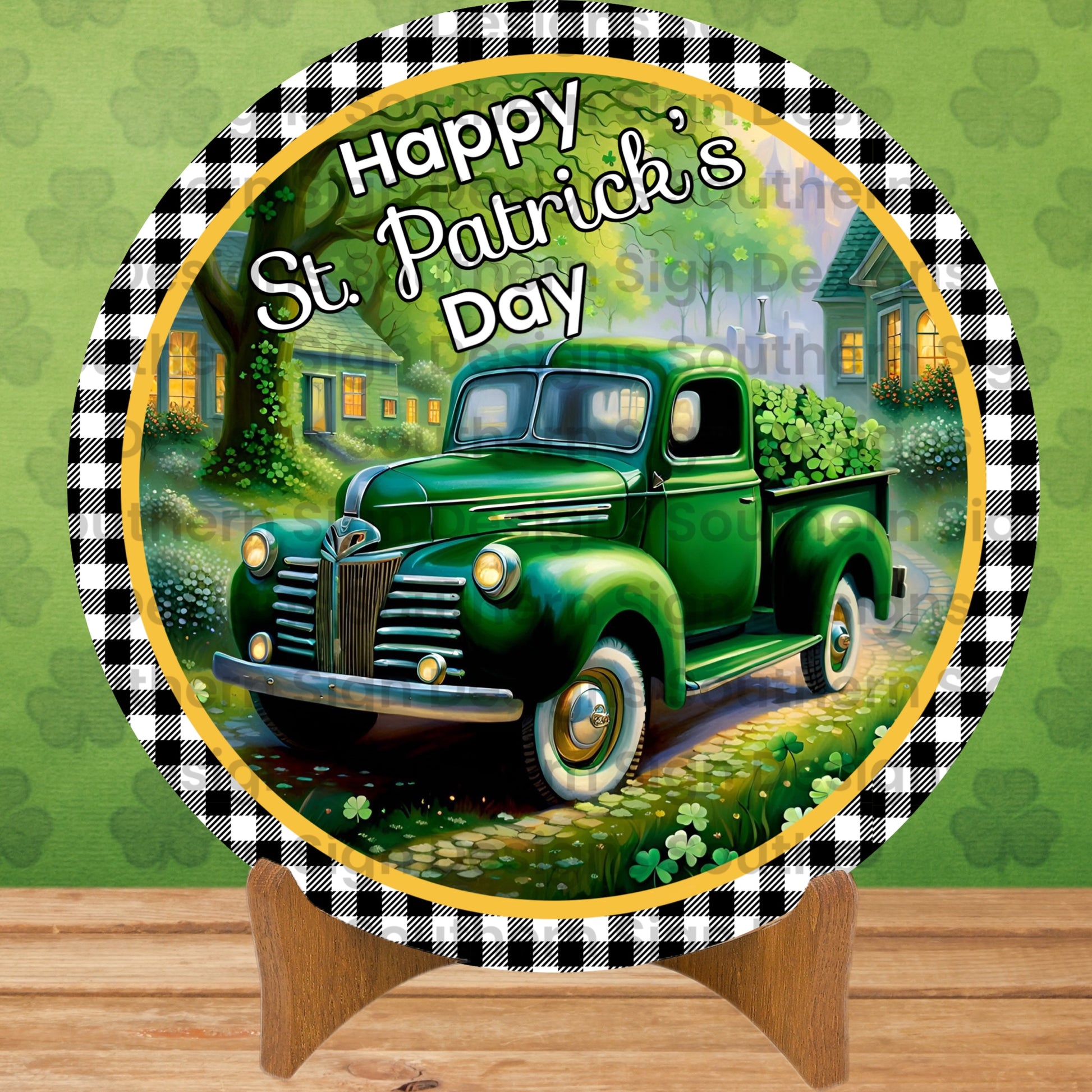 A St Patrick’s Day wreath sign featuring green vintage truck.