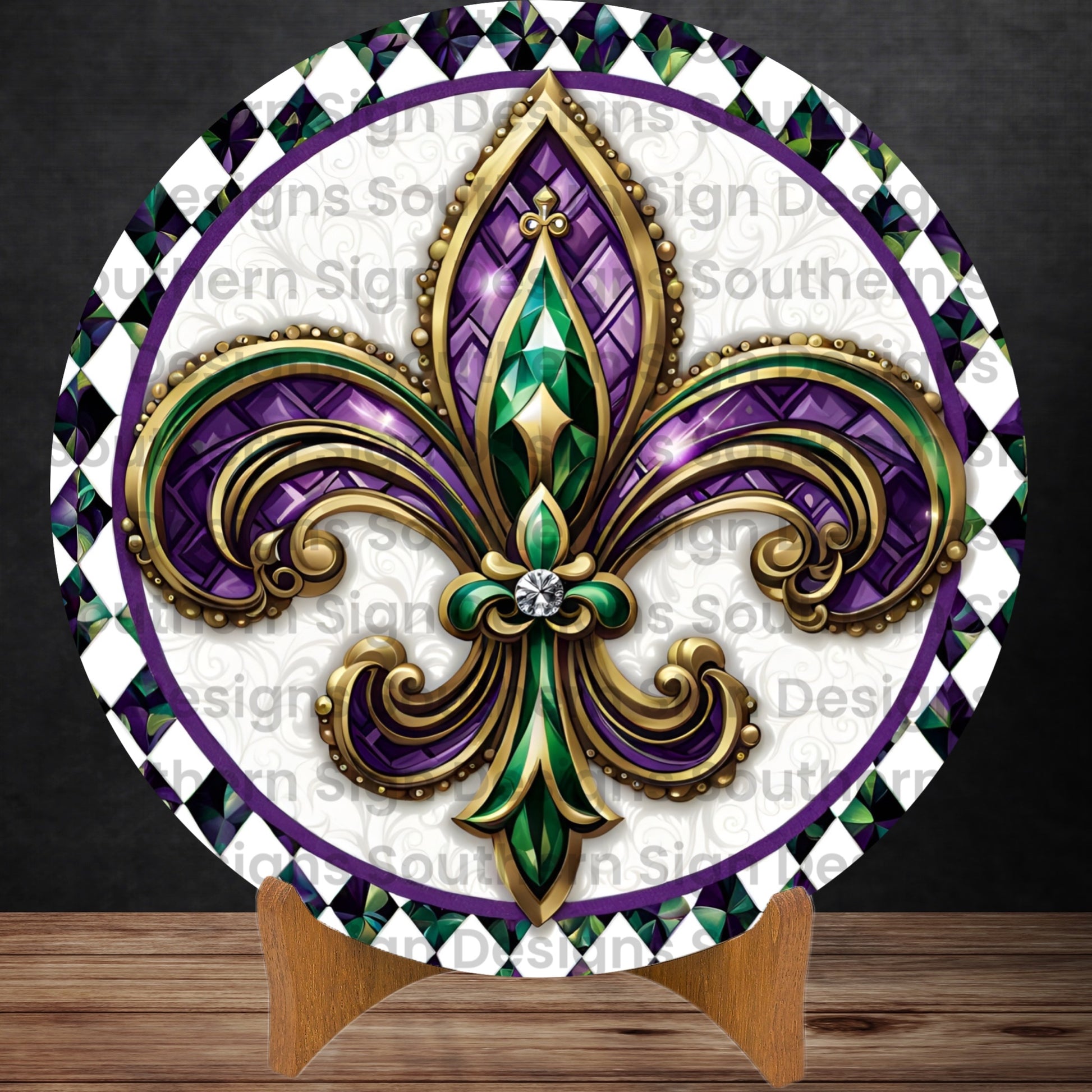 A Mardi Gras wreath sign featuring an image of a fleur de lis.