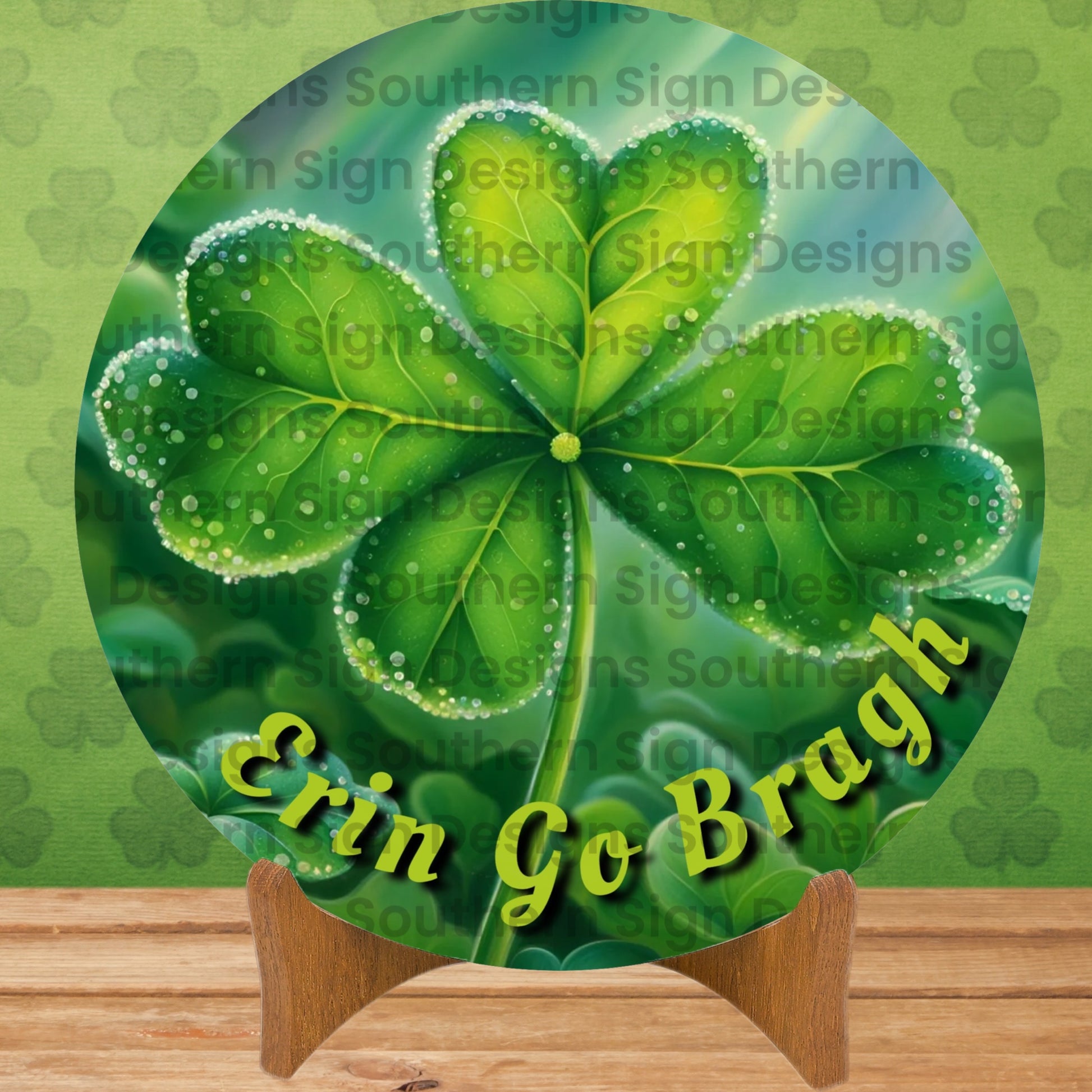A St Patrick’s Day wreath sign featuring a shamrock and the term Erin Go Bragh.