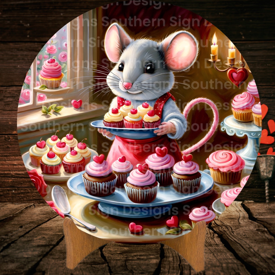 A Valentine wreath sign featuring an adorable mouse baker, baking Valentine goodies.