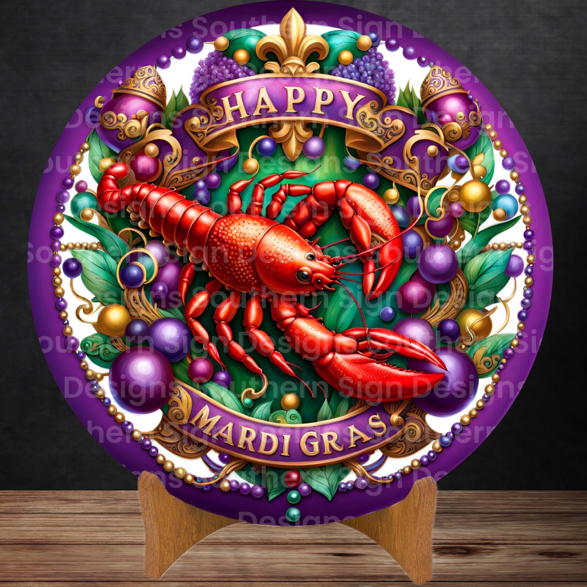 A Mardi Gras wreath sign featuring an image of a festive crawfish.