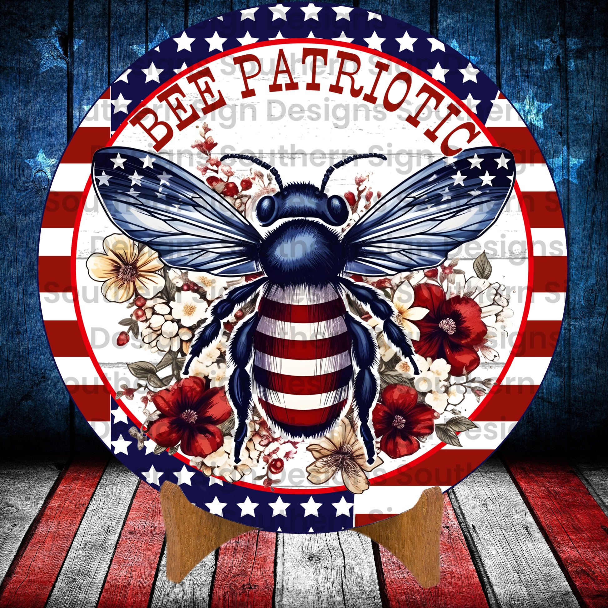 A 4th of July wreath sign featuring an image of a patriotic bee.