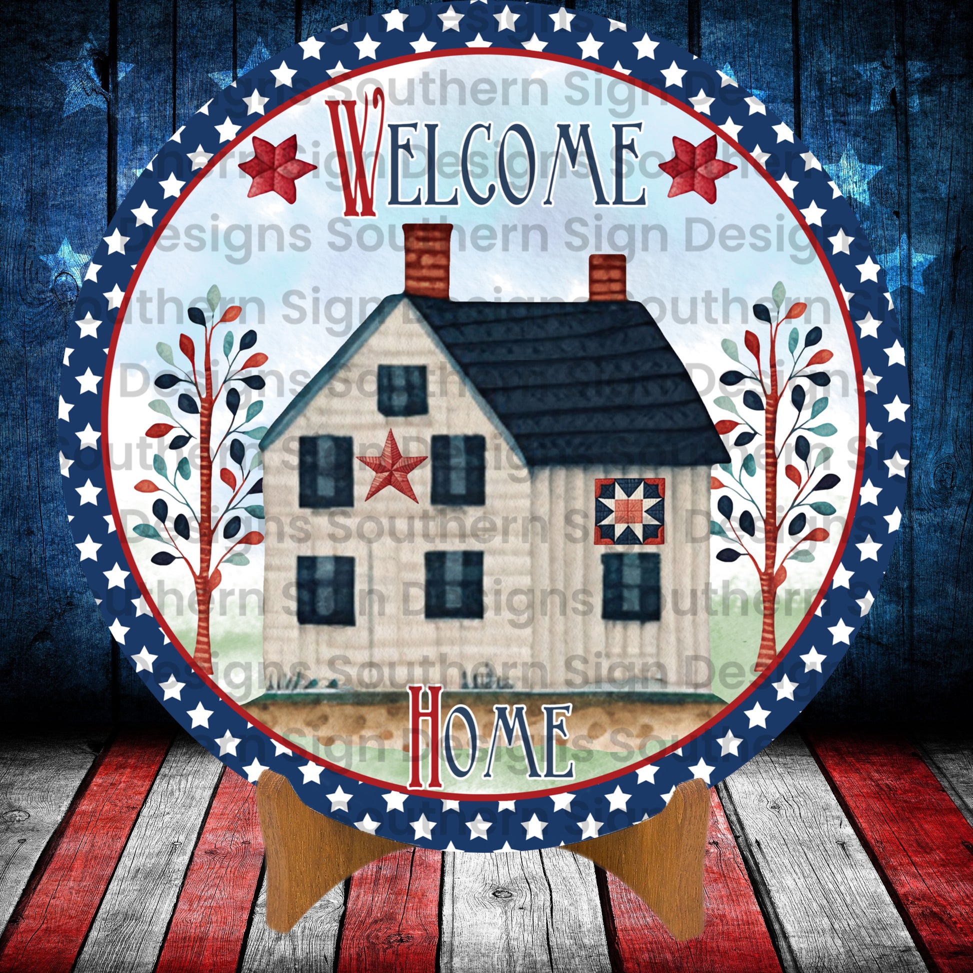A 4th of July wreath sign featuring an image of a patriotic home.