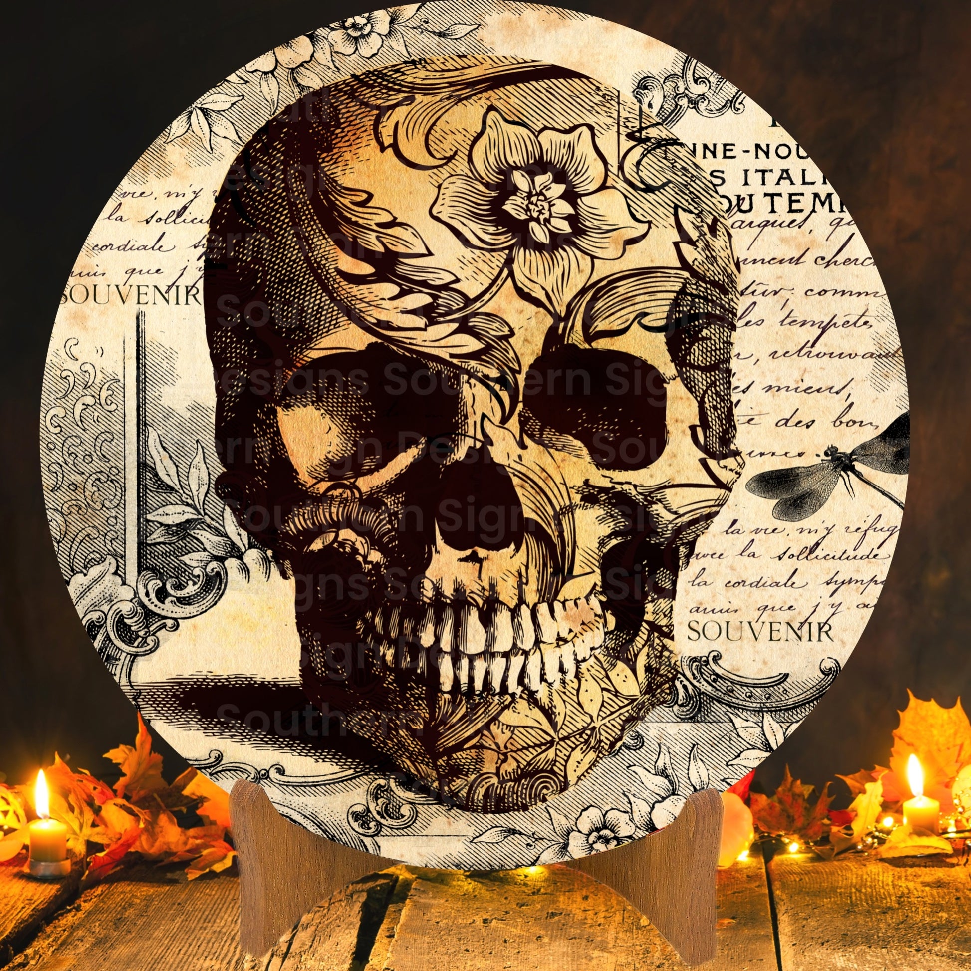 Elevate your Halloween decor with our wreath sign, featuring a captivating floral-printed skull set against an elegant newsprint background that exudes an air of sophisticated mystery. This exquisite piece merges the haunting allure of the skull motif with the charm of vintage newsprint, creating a unique fusion of artistry and intrigue. The meticulously designed details of the floral patterns and the vintage newsprint lend an aura of refined elegance to the composition.