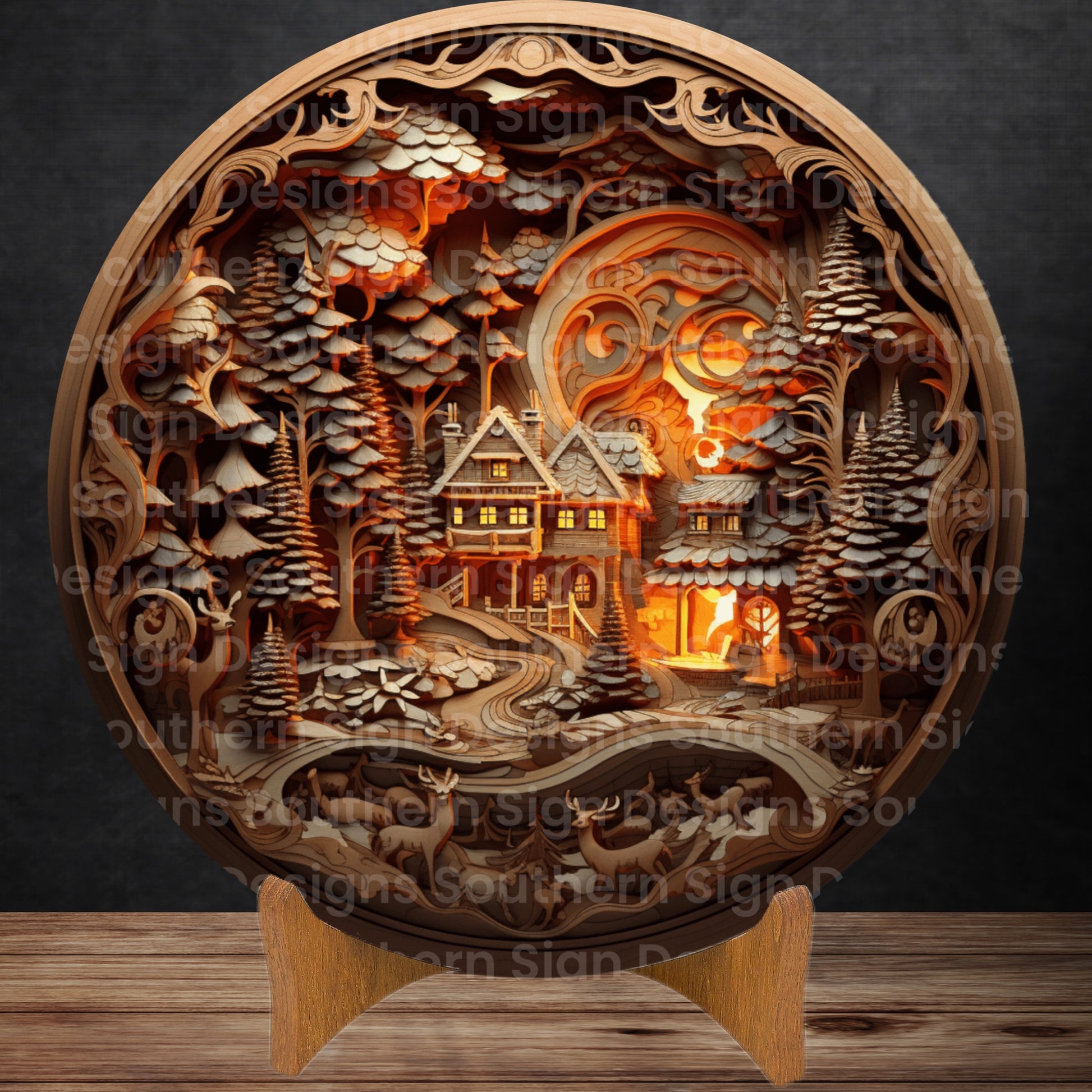 Embrace the warmth of autumn with our enchanting faux wood carving sublimated metal wreath sign, showcasing a picturesque image of a cozy forest home amidst the fall foliage. This exquisitely crafted piece marries the rustic charm of traditional wood carving with the vividness and durability of sublimated metal, bringing to life the intricate details of the charming cottage nestled in a forest ablaze with autumn hues. The golden leaves, the inviting glow from the windows, and the serene ambiance of this woodland dwelling evoke the very essence of autumn's coziness.