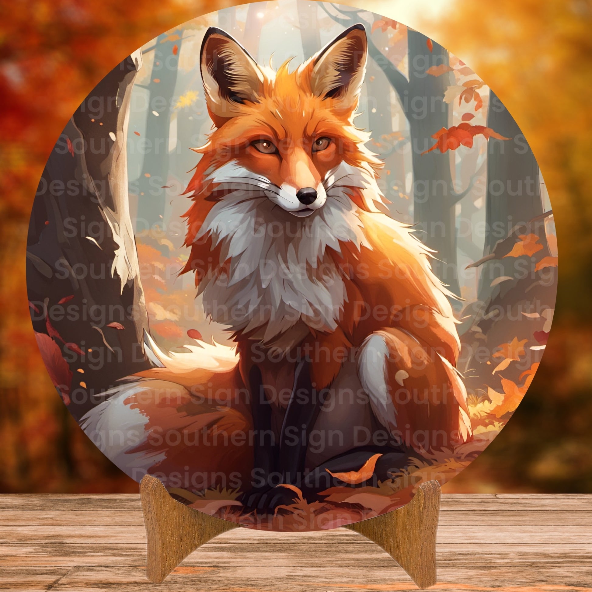 Embrace the serene allure of the autumn woods with our fall wreath sign, capturing a moment of stillness and beauty as a red fox blends seamlessly into the vibrant foliage of the season. This exquisite piece transports you to a tranquil forest scene, where the fox's crimson fur harmonizes with the warm hues of falling leaves. With an air of quiet contemplation, the fox stands as a symbol of nature's elegance and adaptability.