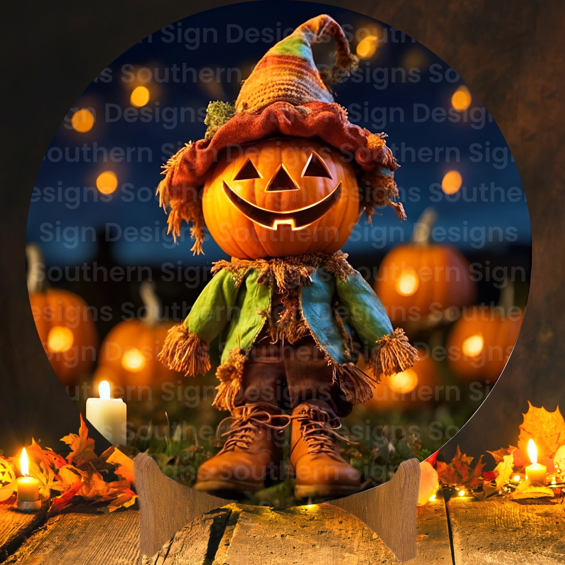 Step into a world of festive fall delight with our charming wreath sign, adorned with the image of a cheerful Jack-o'-lantern scarecrow reveling in the crisp autumn night air. This heartwarming tableau captures the essence of seasonal joy and the simple pleasures of harvest time, as the scarecrow's jovial demeanor harmonizes with the warm glow of the Jack-o'-lantern and the enchanting moonlit backdrop.