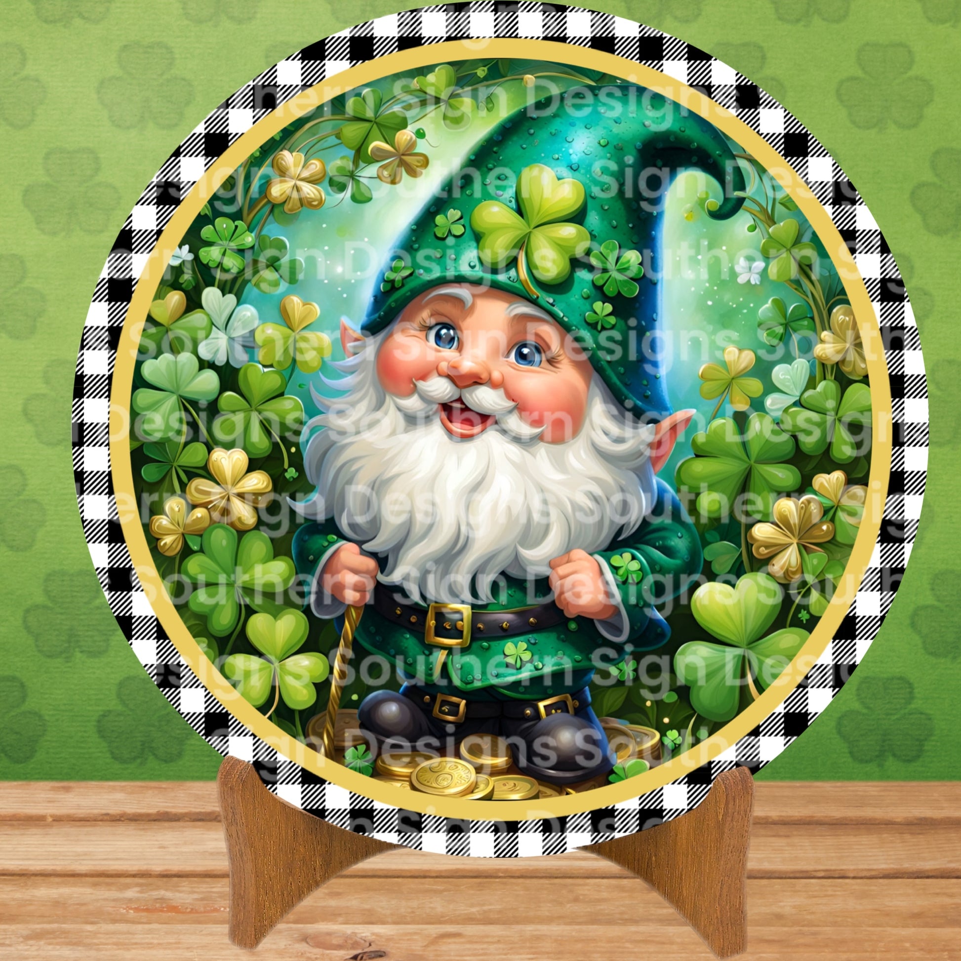 This enchanting wreath sign captures the spirit of St. Patrick's Day and the whimsy of a cheerful gnome in one delightful scene. Crafted from sublimated metal and fortified with UV protection, it showcases a jubilant St. Patrick's Day gnome amidst a backdrop of vibrant greenery. With a mischievous grin and clad in festive attire, the gnome exudes joy and celebration. Surrounding this lively figure are hints of shamrocks and lively greens, embodying the essence of the Irish holiday.