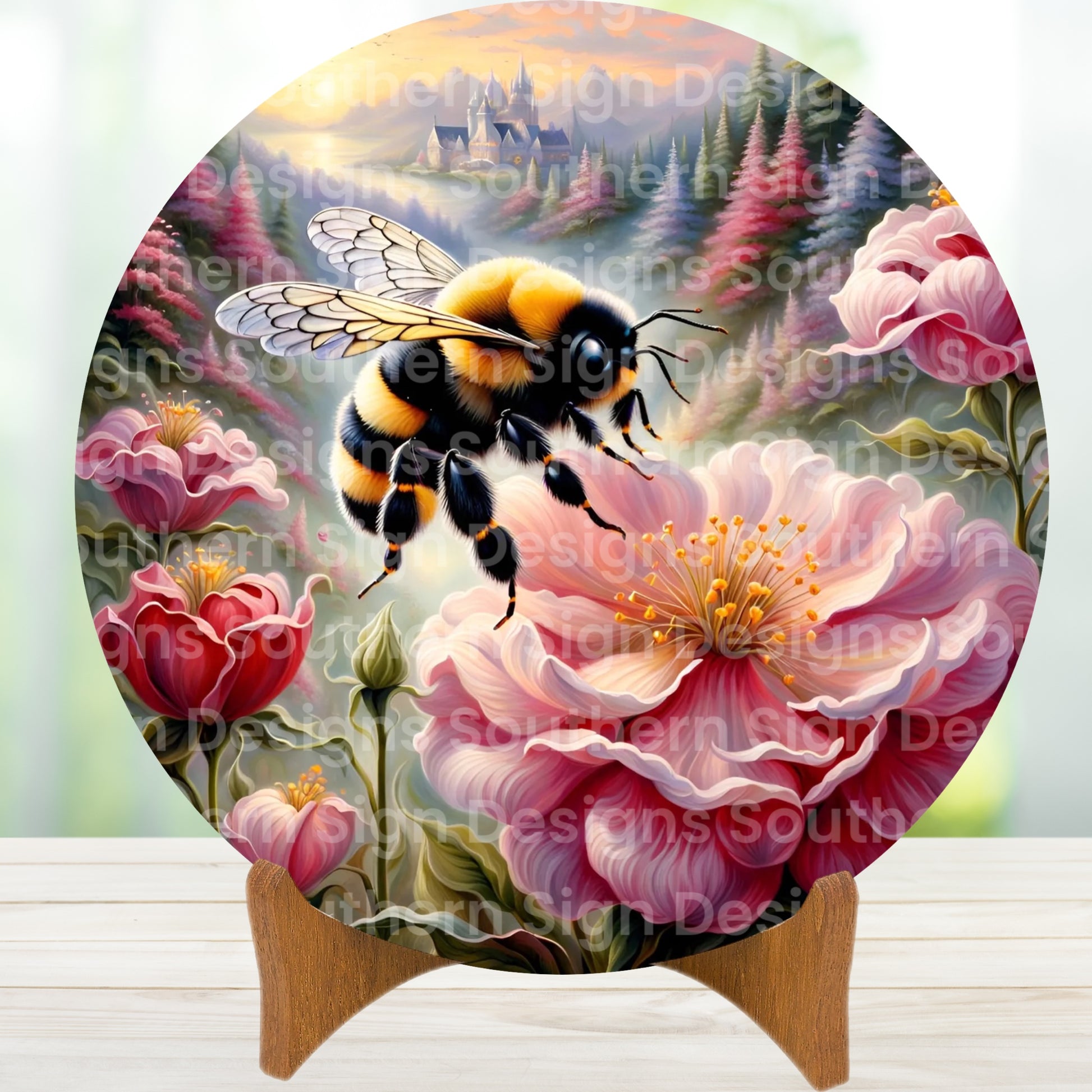 This enchanting wreath sign captures the essence of springtime and nature's beauty in one delightful scene. Crafted from sublimated metal and fortified with UV protection, it showcases a serene image of a honeybee hovering over a delicate pink flower. The intricate details of the bee and the flower evoke a sense of natural harmony and seasonal vibrancy.