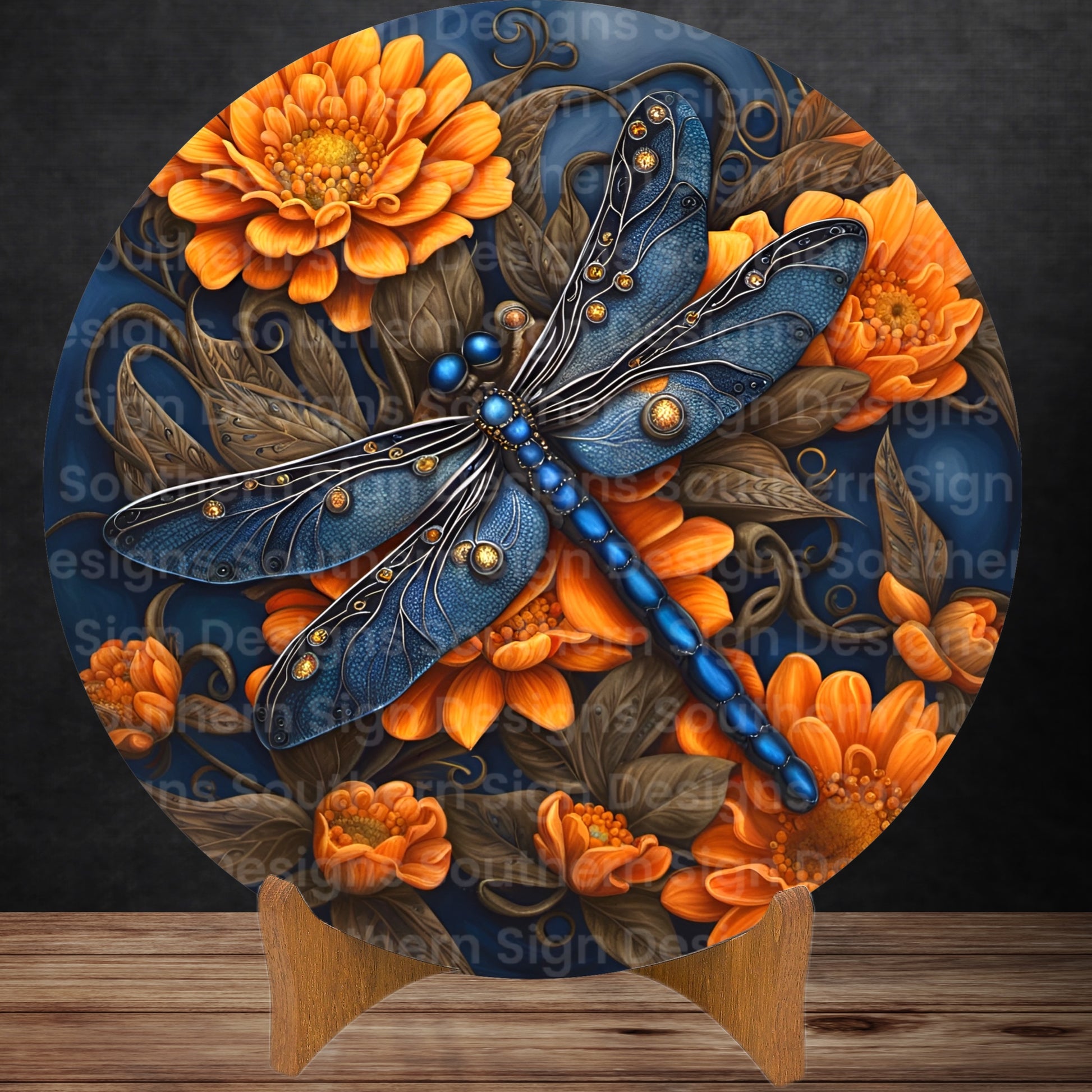 Step into a world of radiant beauty with our captivating wreath sign, adorned with the image of a stunning jeweled dragonfly gracefully perched amid a bed of vibrant orange flowers. This enchanting tableau captures the essence of opulent elegance and the vivid interplay of nature's colors, as the dragonfly's intricate jeweled wings and the blossoming orange flowers merge in a dazzling display of artistry.