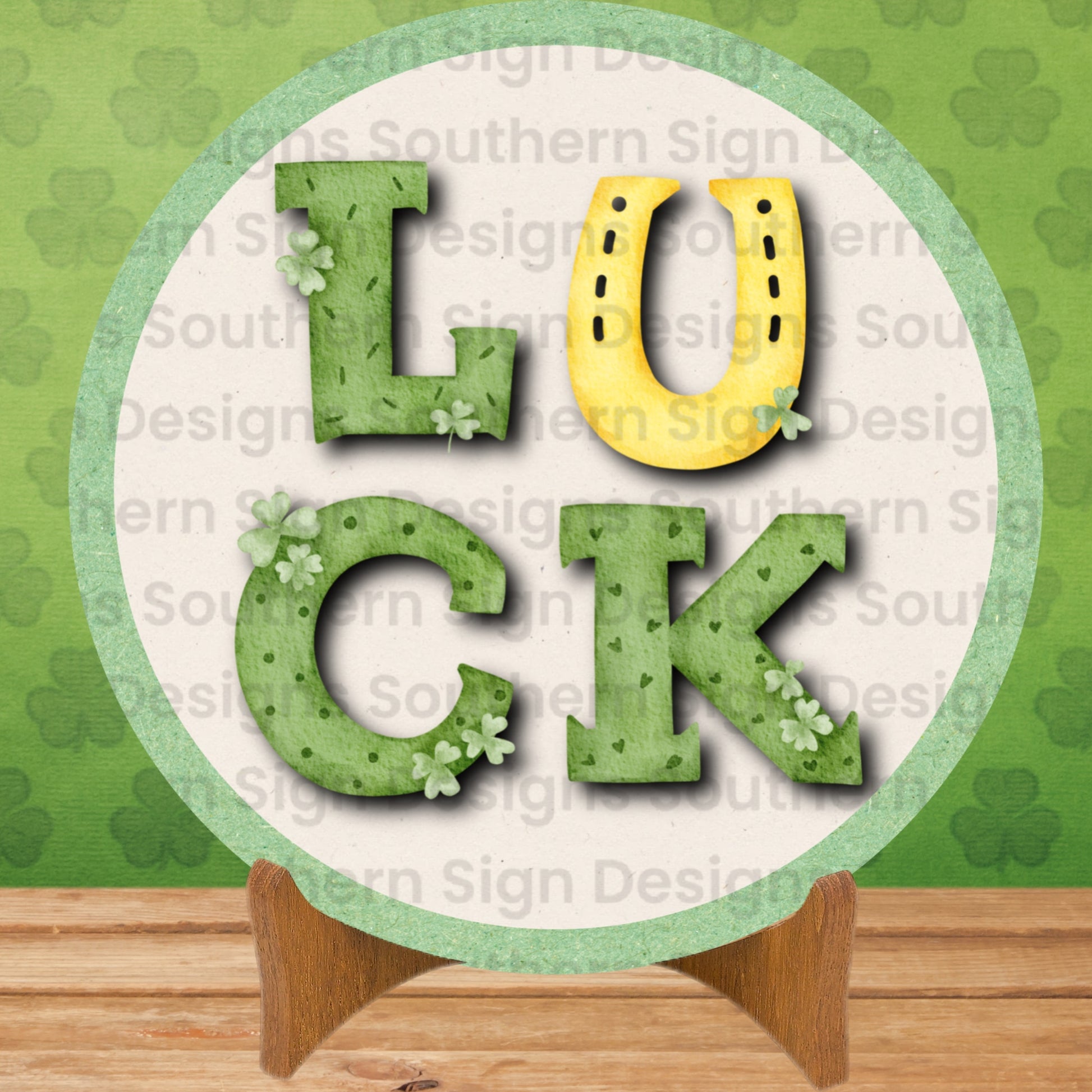 This vibrant wreath sign captures the essence of luck with a striking design featuring the word "luck," where the letter 'U' is cleverly replaced by a golden horseshoe. Crafted from sublimated metal and fortified with UV protection, this design radiates an aura of fortune and prosperity.