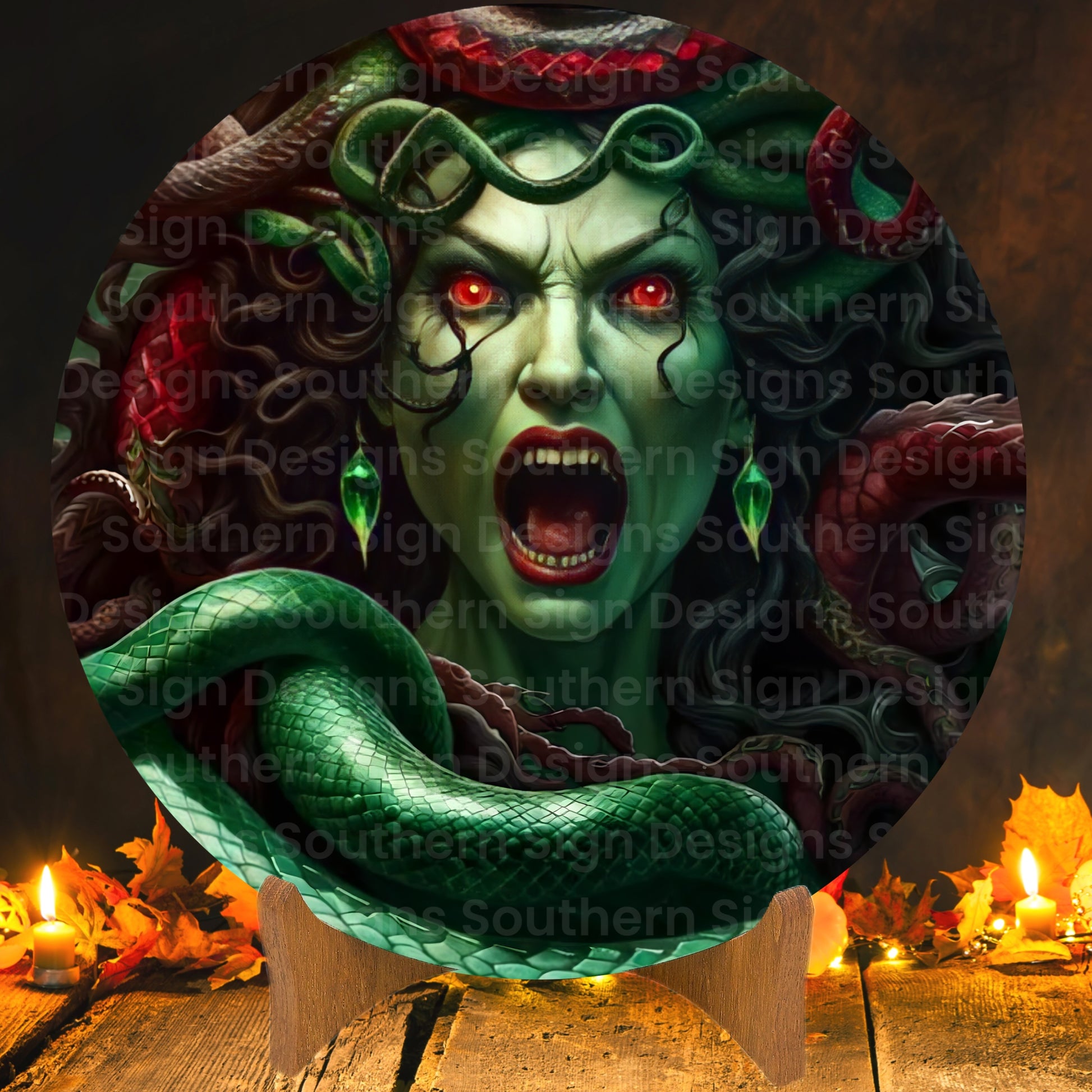 Step into the realm of ancient myth and mystique with our captivating wreath sign, adorned with the image of Medusa, her visage both mesmerizing and fearsome, her eyes glowing an eerie shade of red. This enigmatic tableau captures the essence of mythological intrigue and the enthralling power of Medusa's gaze, as her captivating presence draws you into a world of ancient legends.