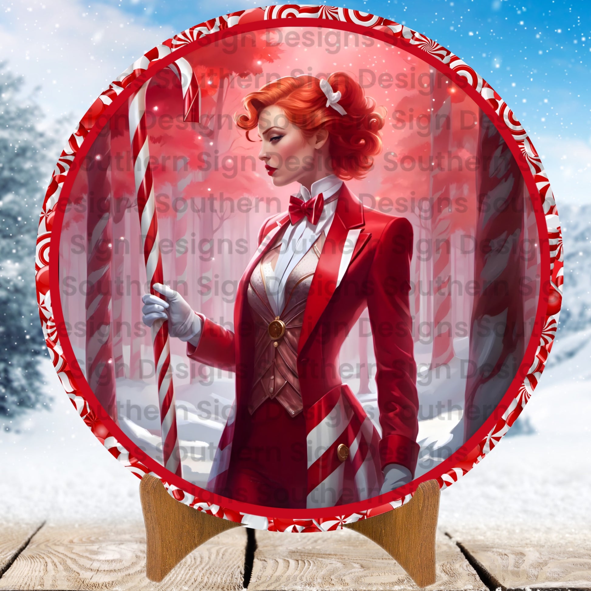 Embark on a journey to a land of sweet wonder with our enchanting wreath sign, graced by the image of the exquisitely dressed Ms Mint, a devoted guardian of the Peppermint Forest. This captivating tableau captures the essence of whimsical magic and the allure of an enchanting world, as Ms Mint's distinguished presence harmonizes with the vibrant hues of the Peppermint Forest.