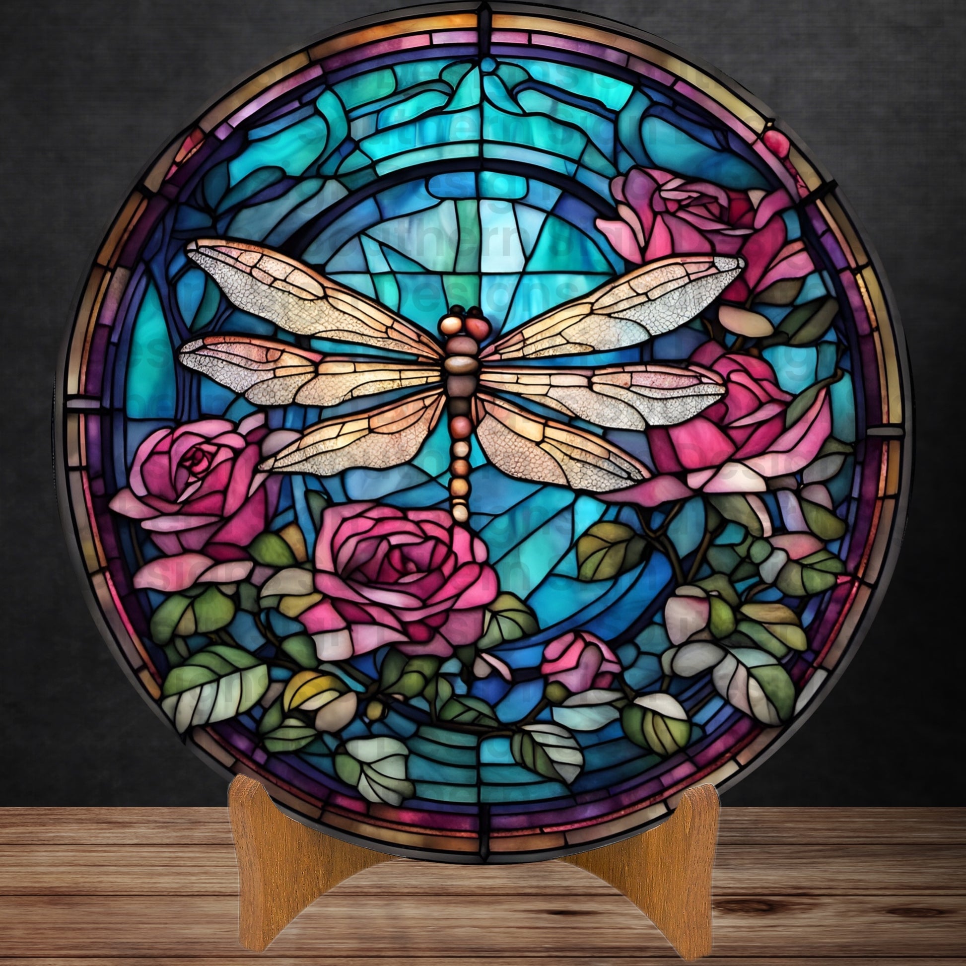Step into a world of intricate beauty with our captivating wreath sign, graced by the image of a stunning stained glass dragonfly amidst a backdrop of delicate roses. This enchanting tableau captures the essence of delicate elegance and the harmonious union of nature's wonders, as the dragonfly's intricate wings and the vibrant hues of the roses blend in mesmerizing artistry.