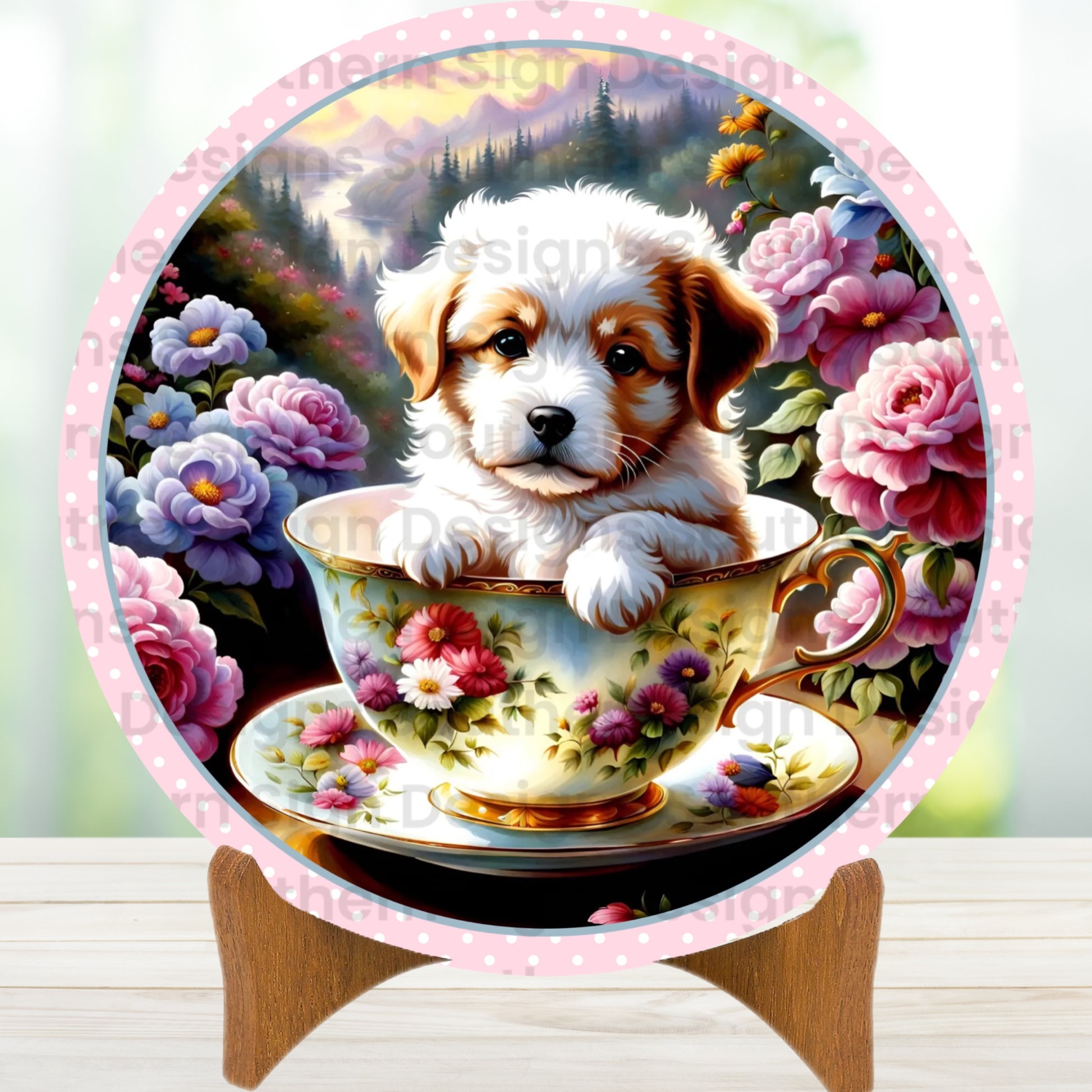 This delightful wreath sign captures the heart with its whimsical charm and durable design. Crafted from sublimated metal and fortified with UV protection, it showcases an endearing image of a precious puppy comfortably seated in a teacup. The vibrant colors and intricate details bring this adorable scene to life, evoking joy and warmth. Encircled by a captivating border, this heartwarming portrayal is a testament to coziness and playfulness. Perfect for any space, it adds a touch of sweetness and cheer, making it an irresistible accent for welcoming environments.