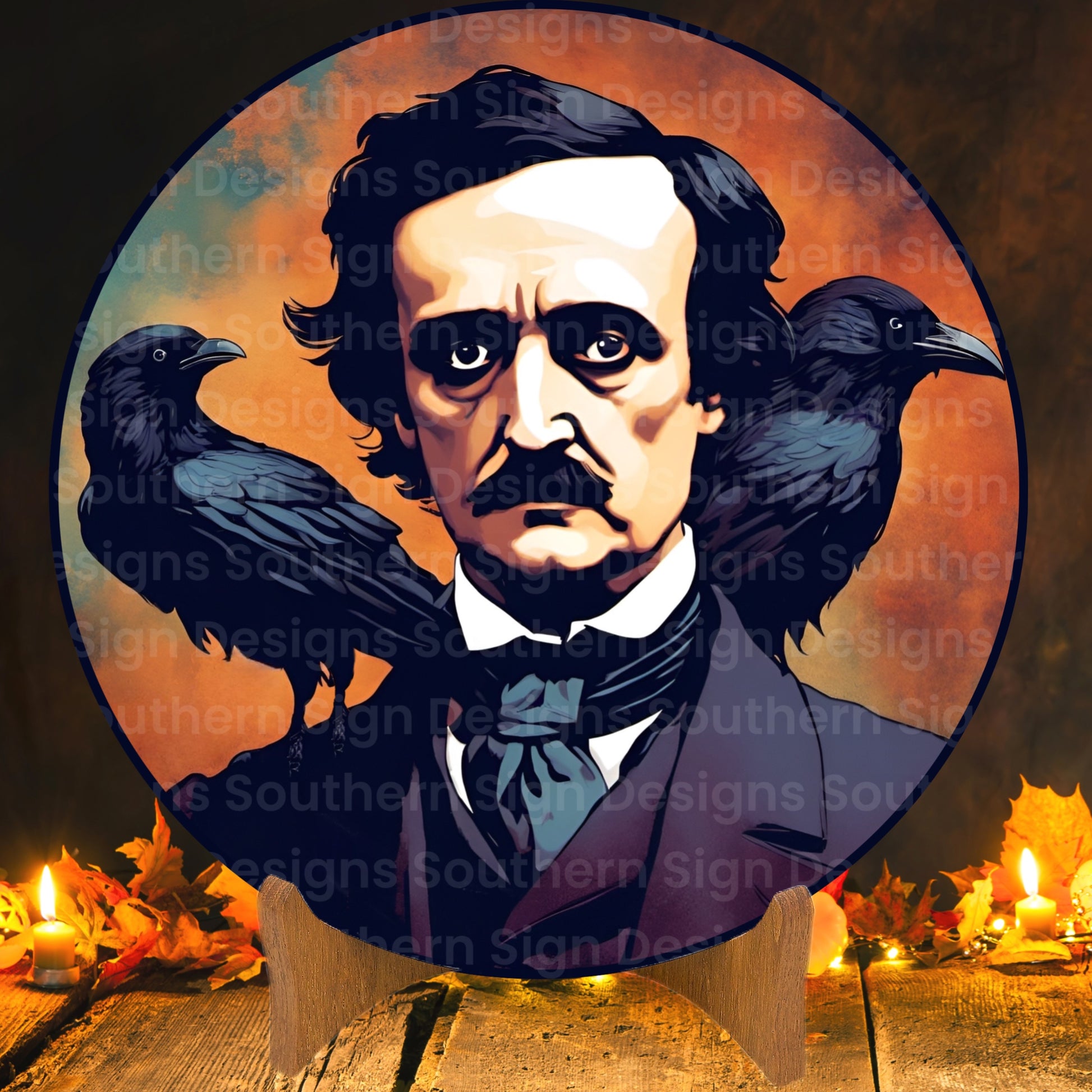 Step into the realm of literary intrigue with our captivating wreath sign, adorned with the image of the iconic Edgar Allan Poe accompanied by a raven, a symbol of his haunting poetry. This evocative tableau captures the essence of Gothic mystery and literary legacy, as Poe's enigmatic presence harmonizes with the raven's dark allure.