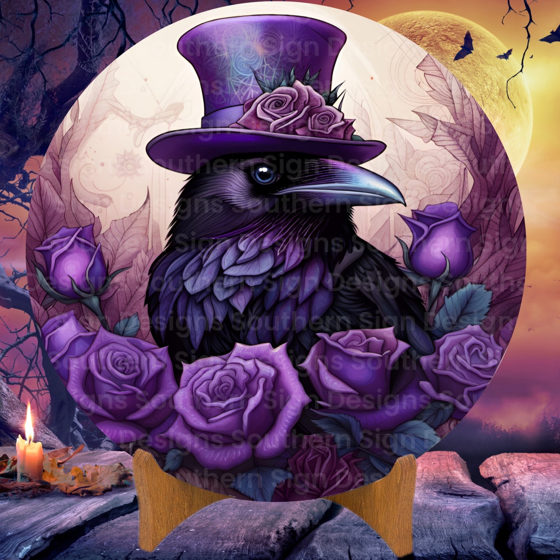 Raven with Purple Top Hat and Purple Roses Halloween Wreath Sign