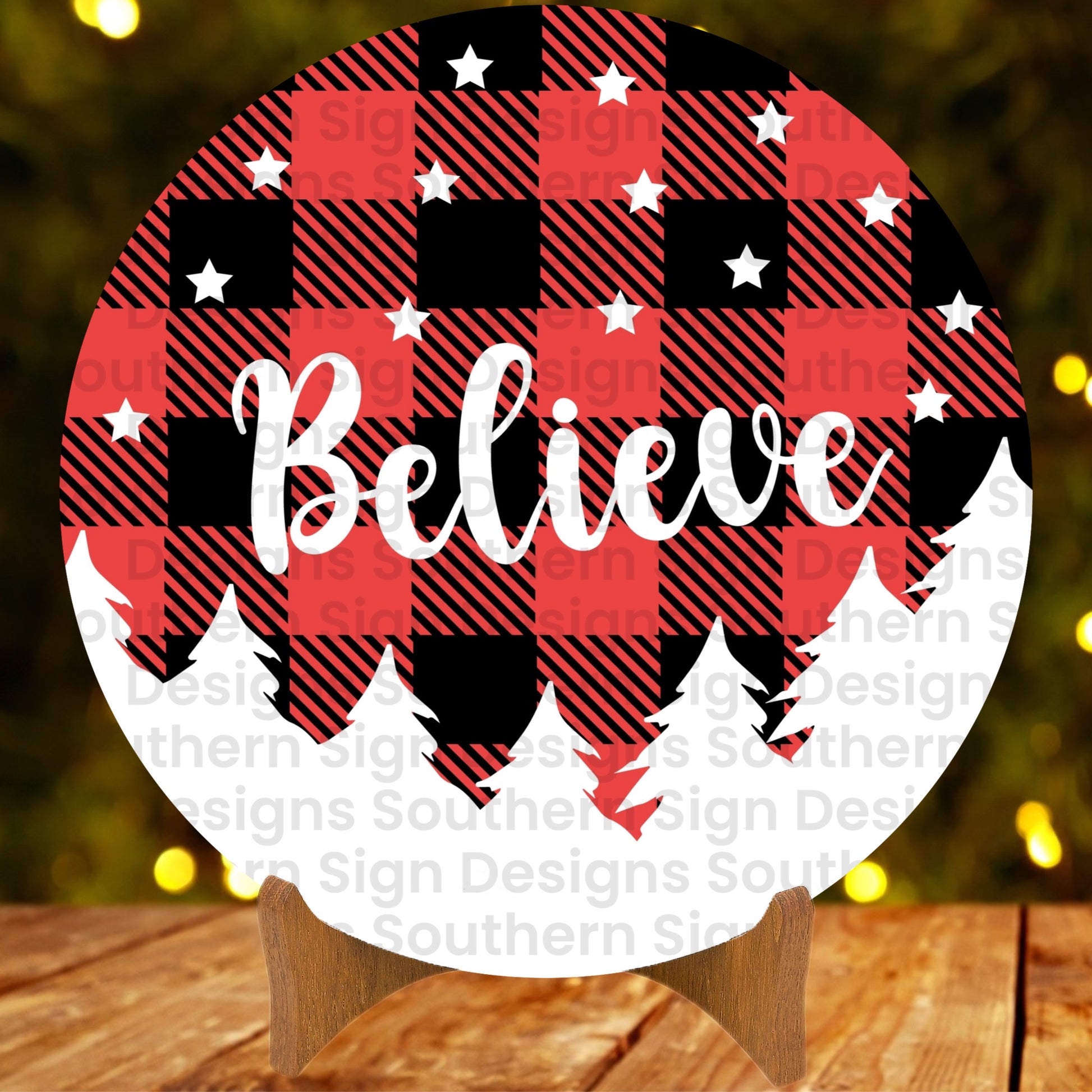 Transform your space into a haven of comfort and holiday wonder with our cozy Christmas wreath sign, adorned against a backdrop of red and black buffalo plaid. The design features elegant white cutouts of stars, evergreen trees, and the poignant word 'Believe,' creating an enchanting tableau that captures the essence of seasonal magic and heartfelt sentiment. The charming arrangement of elements and the simple yet powerful lettering exude an air of warmth and festive allure.