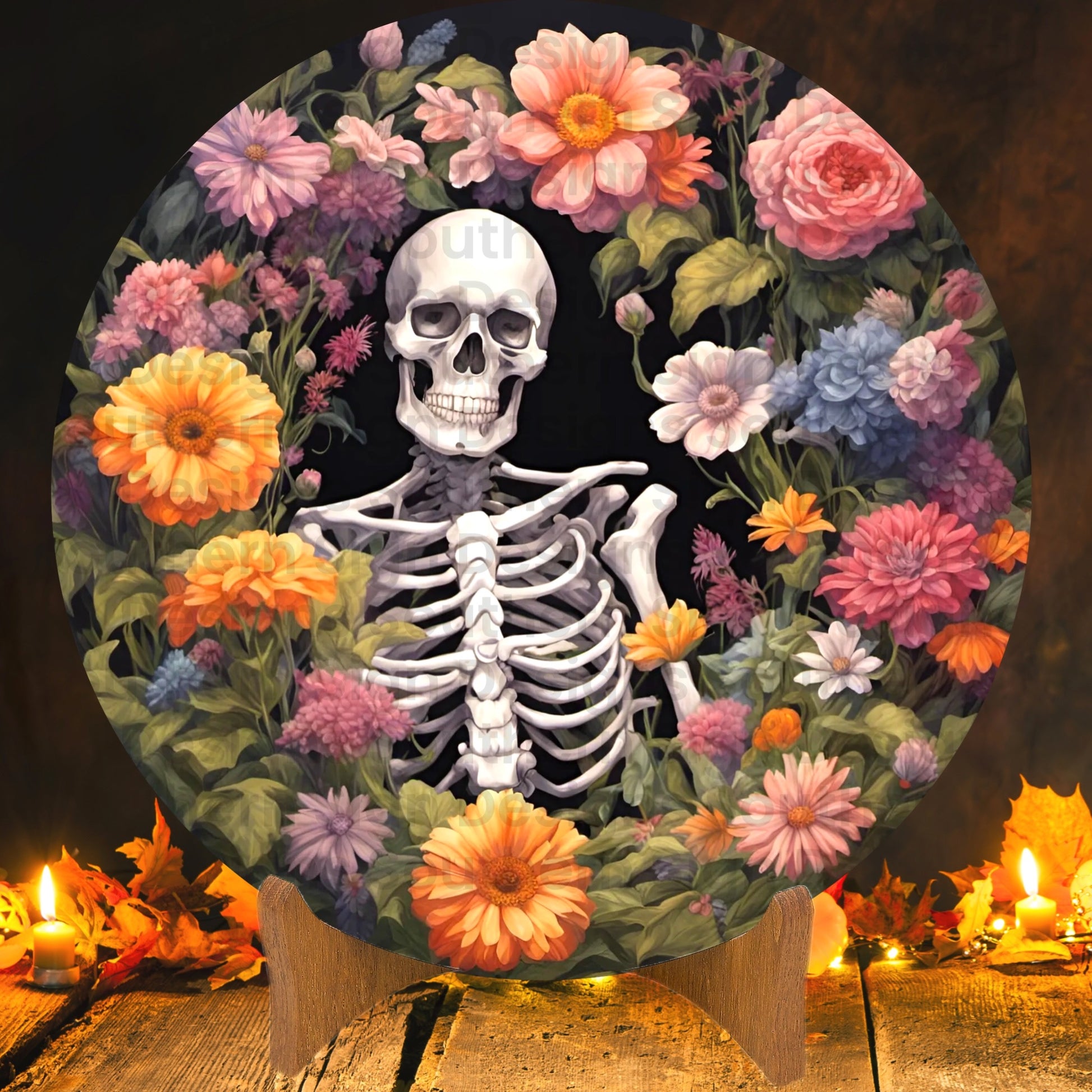 Skeleton Relaxing in a Bed of Flowers Halloween Wreath Sign