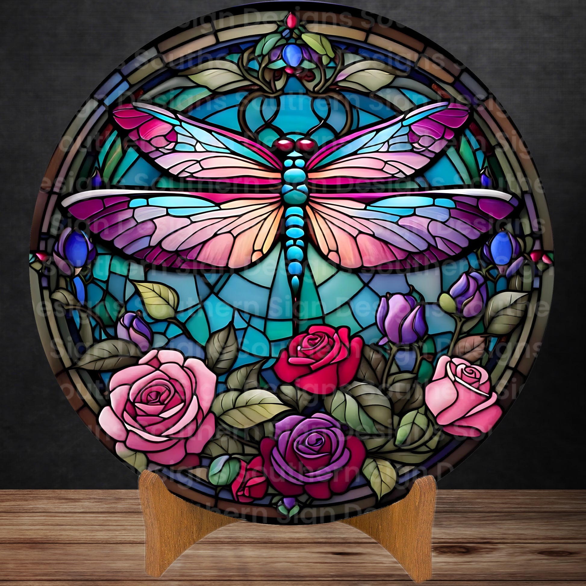 Step into a world of intricate beauty with our captivating wreath sign, graced by the image of a stunning stained glass dragonfly amidst a backdrop of delicate roses. This enchanting tableau captures the essence of delicate elegance and the harmonious union of nature's wonders, as the dragonfly's intricate wings and the vibrant hues of the roses blend in mesmerizing artistry.