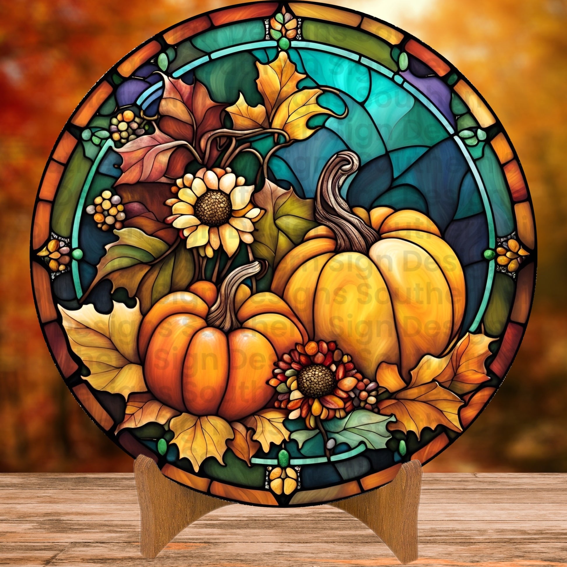 Embrace the captivating beauty of autumn's palette with our enchanting wreath sign, adorned with a harmonious arrangement of stained glass pumpkins and delicate autumn flowers. This exquisite piece encapsulates the essence of seasonal transition, as the intricate play of colors and textures evokes a sense of vibrant elegance.