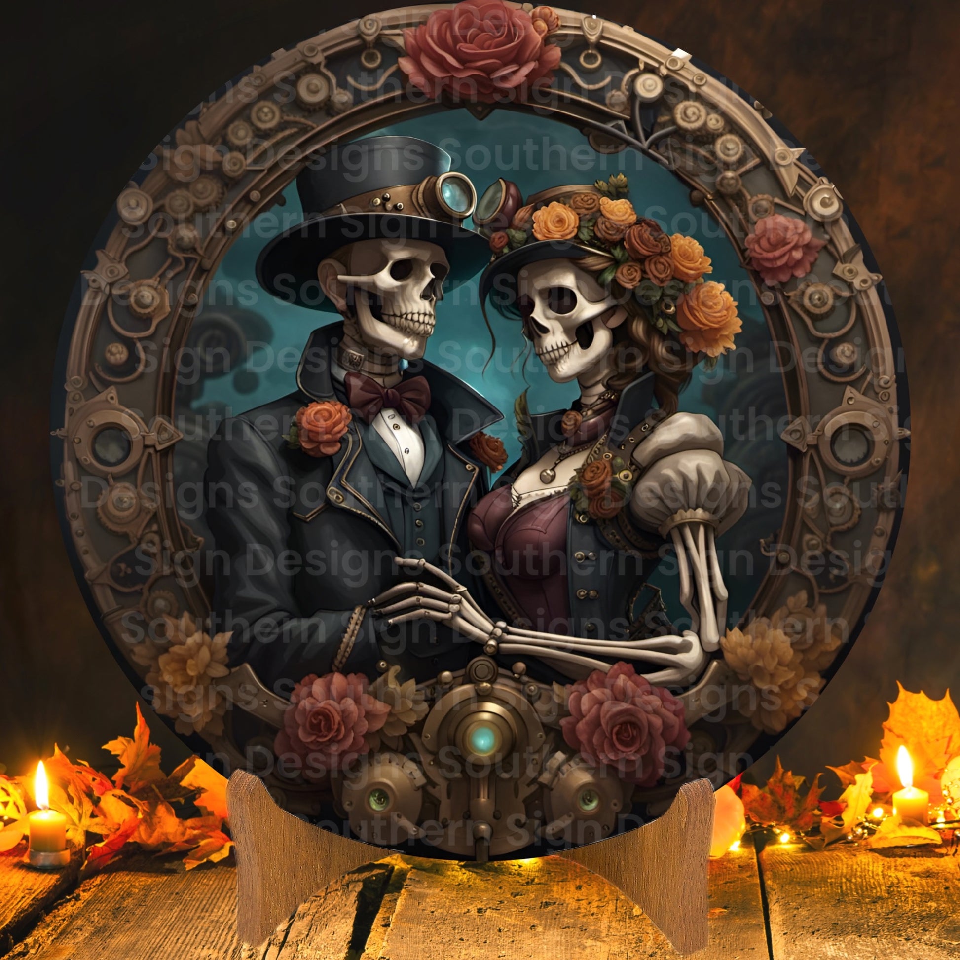 Steampunk Skeleton Couple Halloween Wreath Sign