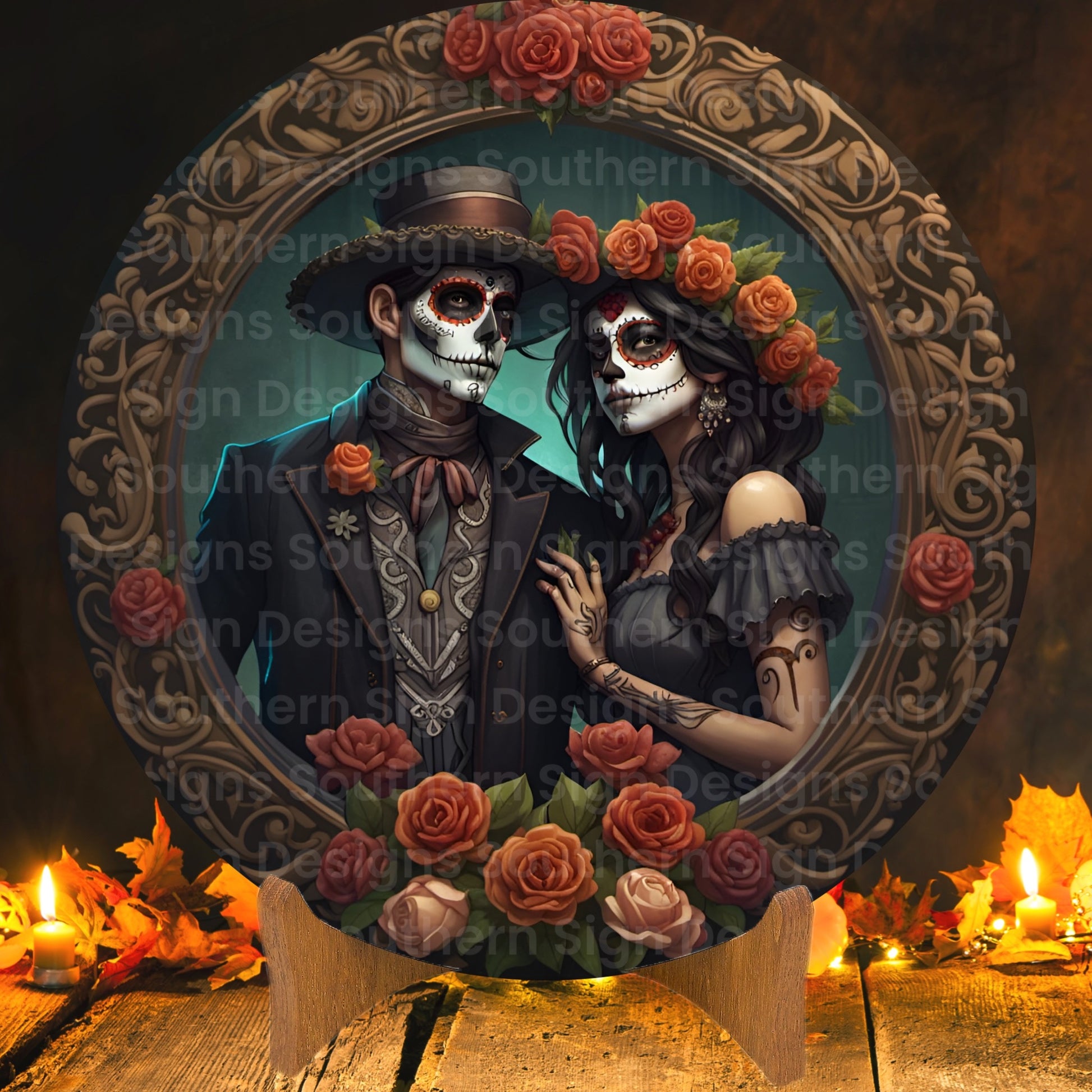 This wreath sign pays homage to tradition and affection, as the sugar skull couple's delicate features intertwine in a graceful dance of intimacy. Their beautifully adorned skulls, painted with vibrant hues and adorned with ornate patterns, reflect a harmonious blend of celebration and respect for the past. With a touch of artistry and sentiment, this wreath sign radiates an aura of endearing charm, making it a heartfelt addition to your door or wall that resonates with those who cherish both the present moment and the legacies that precede it.