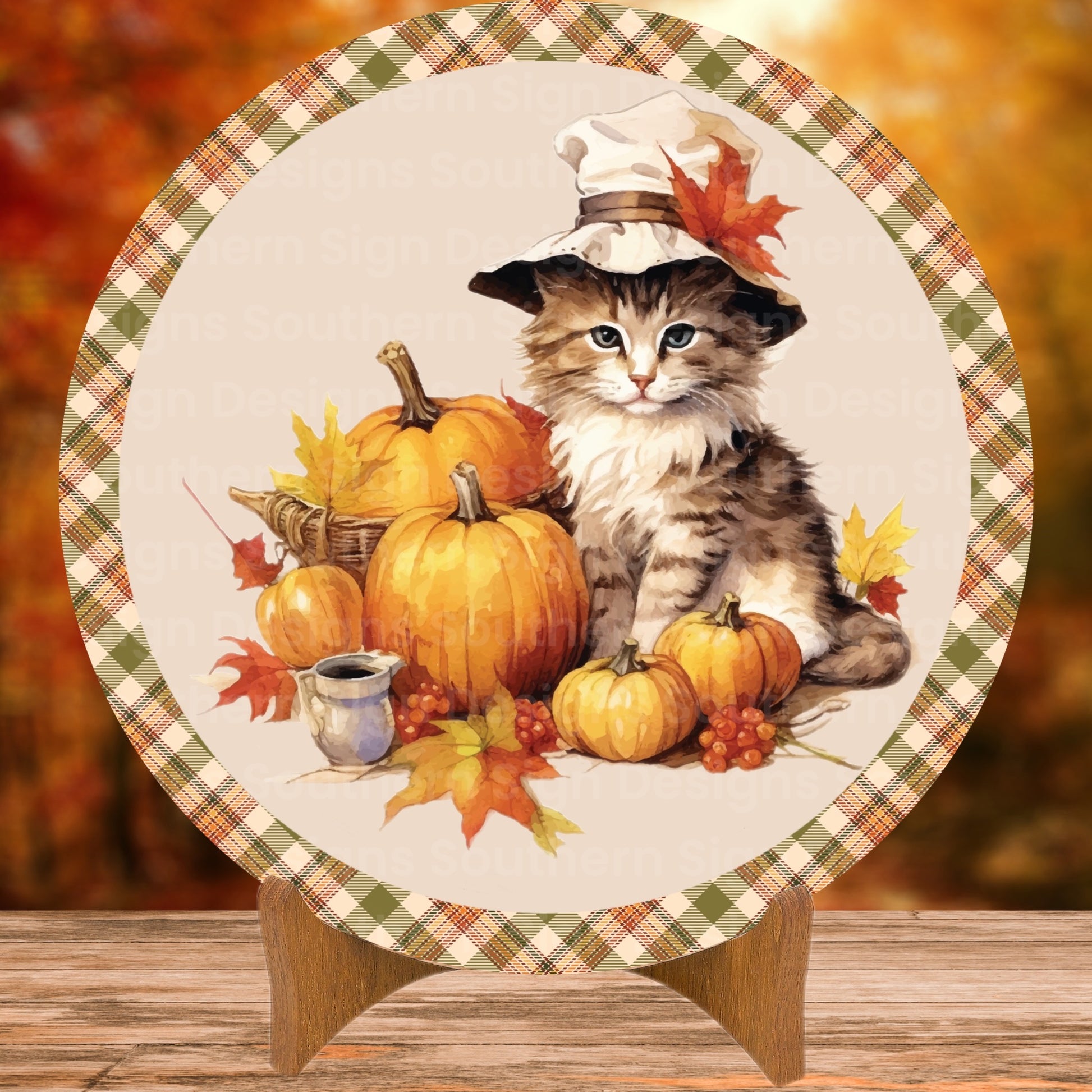 Embrace the charm of autumn with our fall wreath sign, capturing an endearing moment as a sweet kitten dons its cherished fall hat amidst a circle of rustic pumpkins. This heartwarming scene encapsulates the essence of seasonal coziness, as the kitten's innocent curiosity harmonizes with the rustic charm of the pumpkins. With meticulous attention to detail, from the kitten's playful expression to the textures of the pumpkins, this wreath sign radiates a sense of warmth and delight.