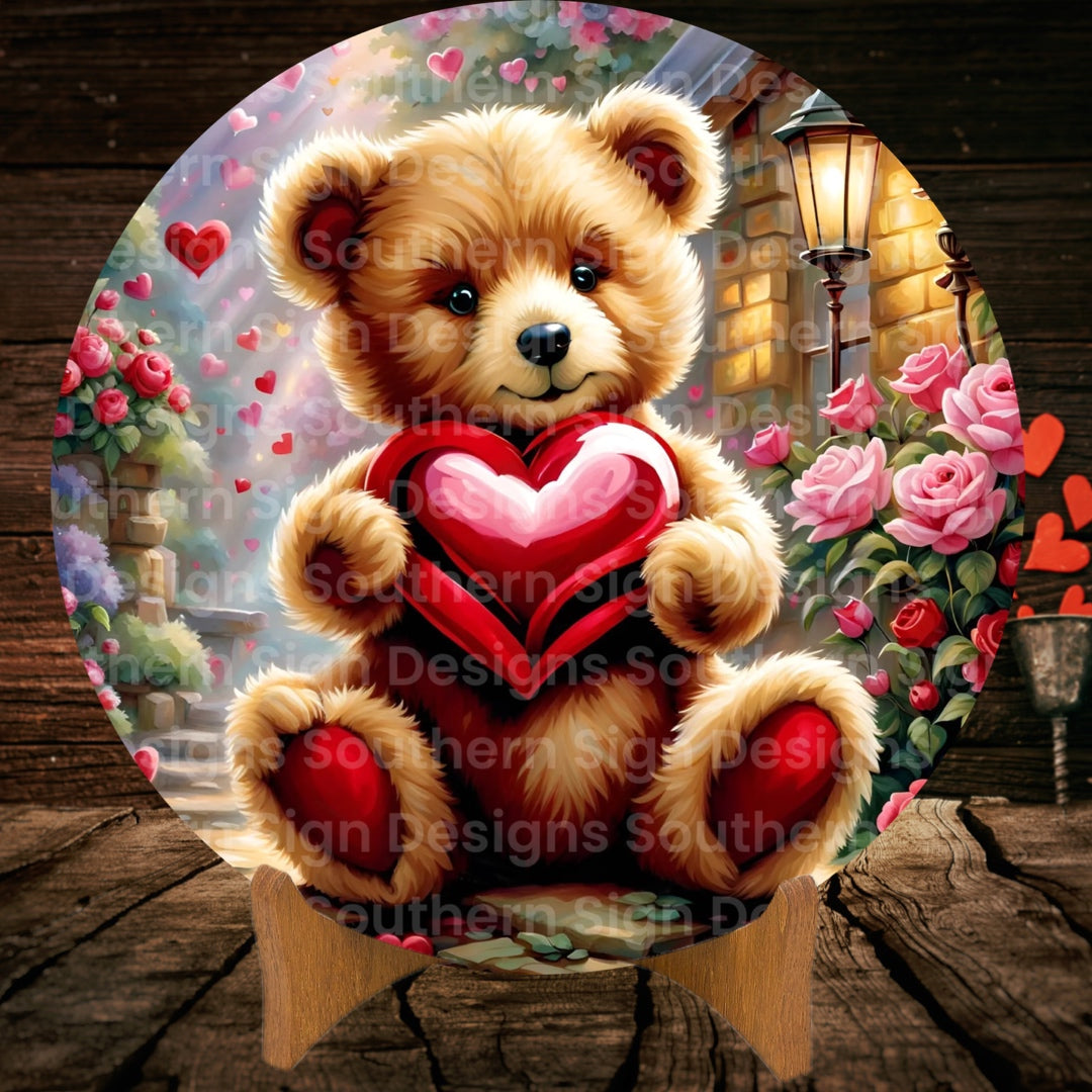 Sweet Teddy Bear Holding Heart Valentine Wreath Sign