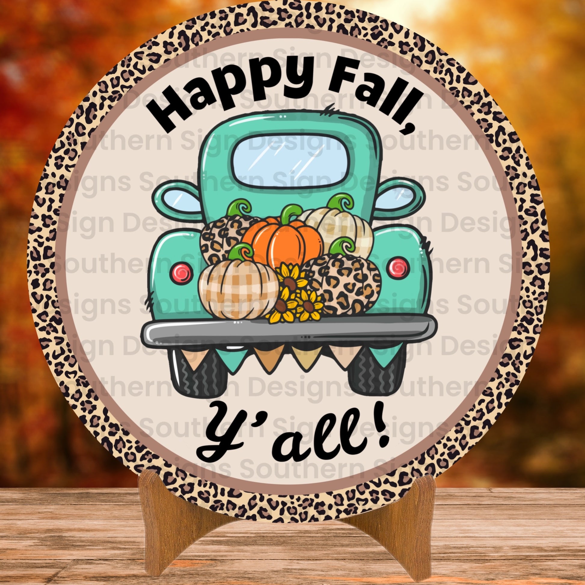 Teal Vintage Truck with Leopard Print Pumpkins Fall Wreath Sign