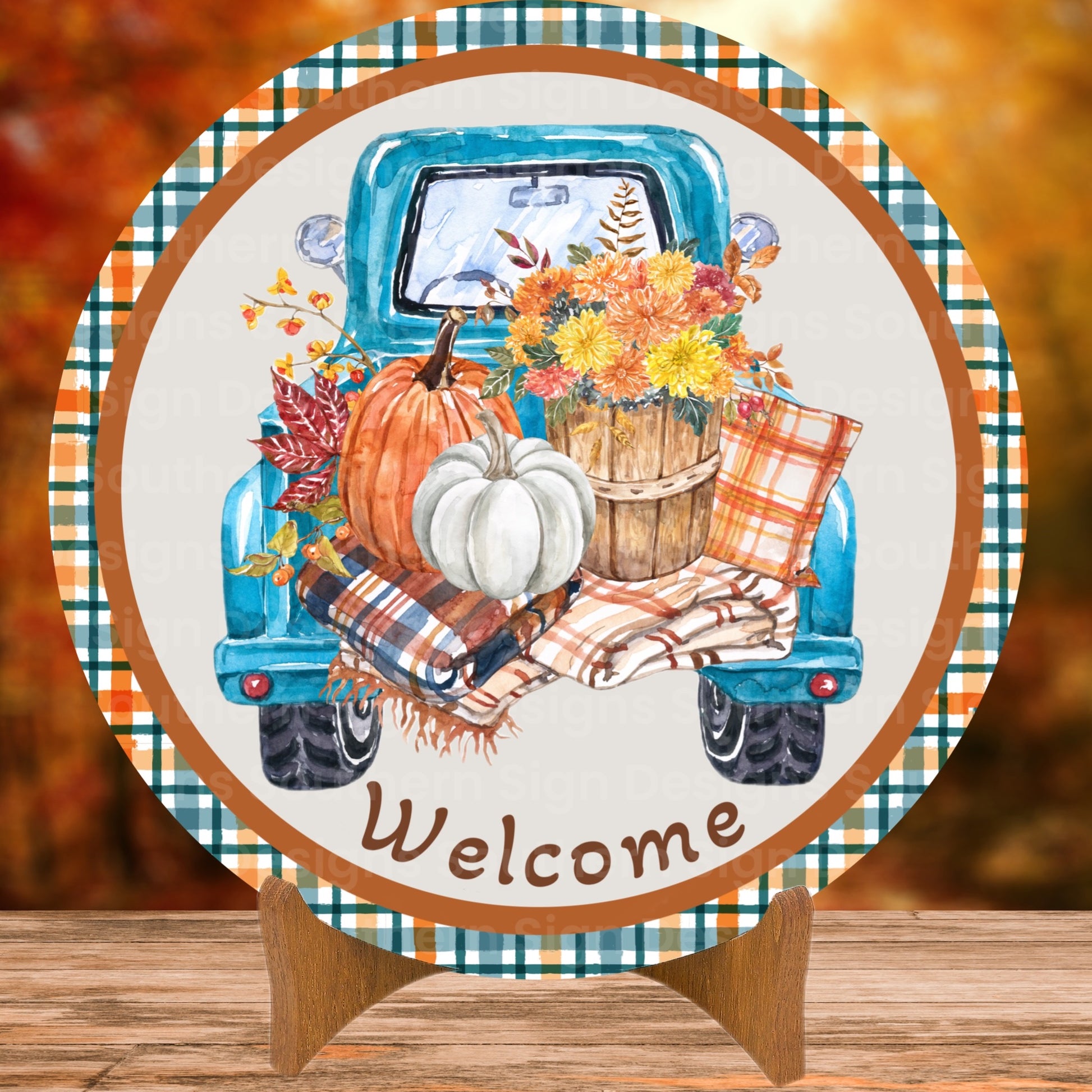Capture the nostalgia of autumn with our fall wreath sign, showcasing a vintage blue truck laden with rustic charm as its bed overflows with cozy blankets and an array of plump pumpkins. This evocative scene encapsulates the essence of seasonal comfort, as the truck embodies the enduring allure of yesteryears and the simple joys of the harvest. Meticulous details, from the truck's weathered elegance to the textures of the blankets and pumpkins, infuse the scene with a sense of heartfelt warmth.