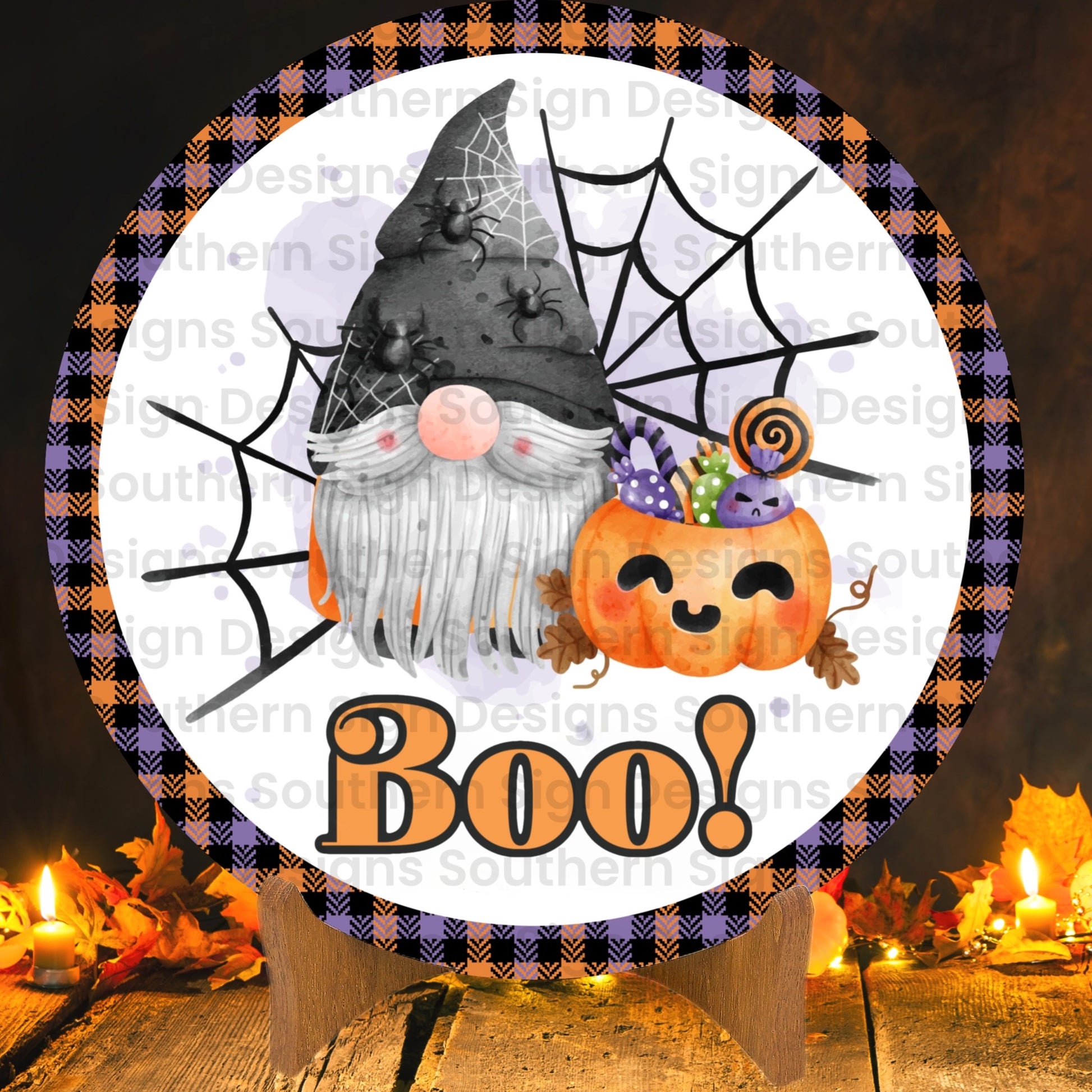 Celebrate the enchantment of Halloween with our wreath sign, portraying an adorable Halloween gnome brimming with youthful delight as he clutches his candy-filled bucket, rendered in soft and inviting watercolors. This heartwarming piece captures the essence of the season's innocent wonder, as the gnome's endearing expression and candy bounty evoke a sense of playful anticipation. Crafted with intricate detail and gentle hues, this wreath sign radiates an air of delightful nostalgia and artistic charm.