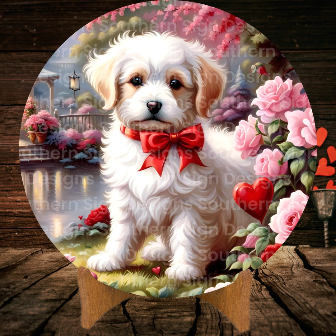 A Valentine wreath sign featuring an adorable white fluffy puppy.